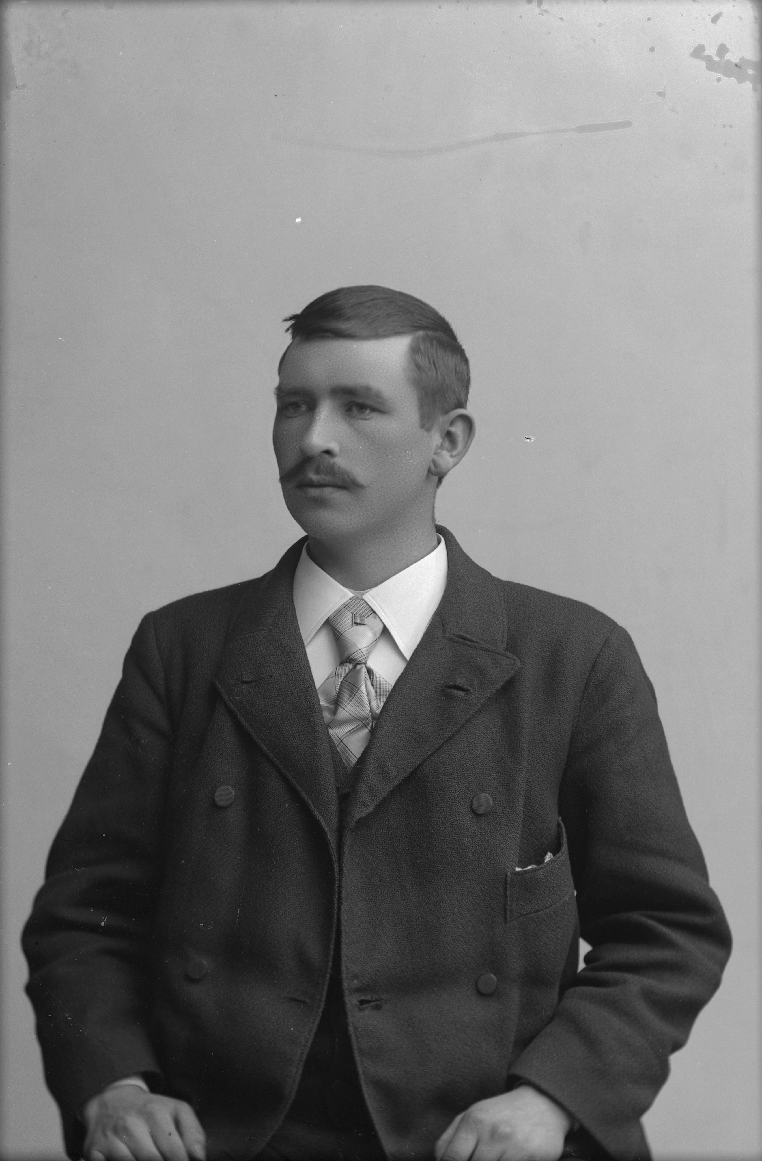 Beskrivning: Porträtt i halvfigur av styrman Olof H. Olsson i Simrishamn.