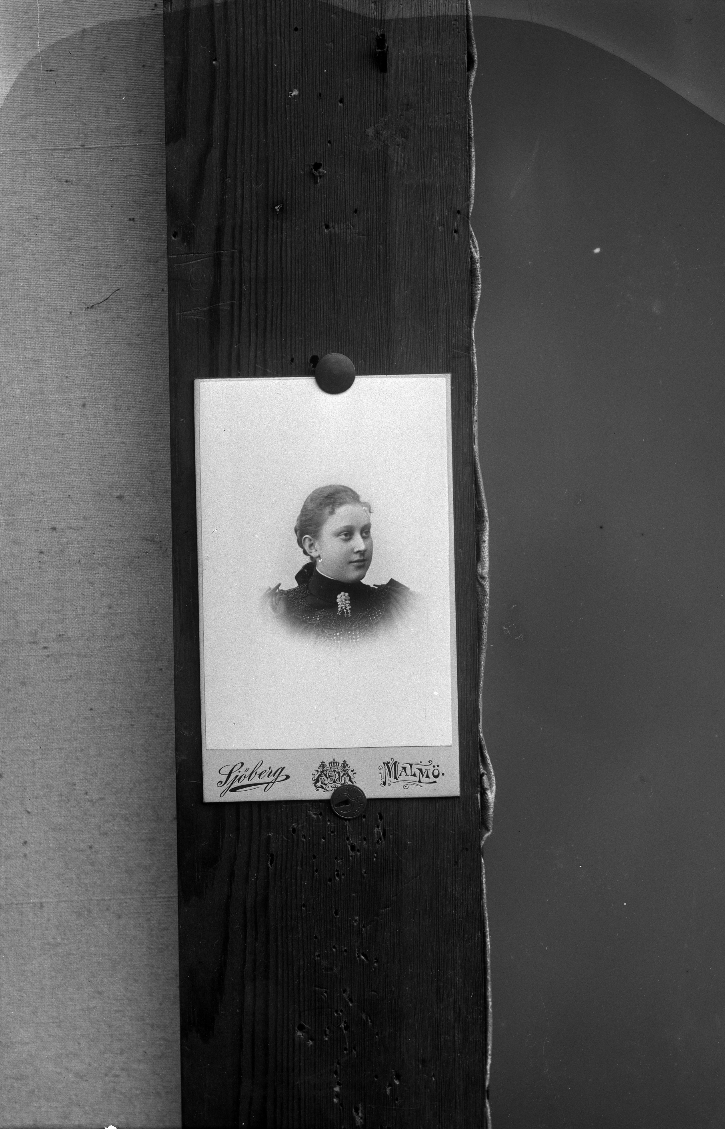 Beskrivning: Porträtt i halvfigur av Elisabeth Gyllin. Visitkort med ateljélogotyp "Sjöberg /Malmö".