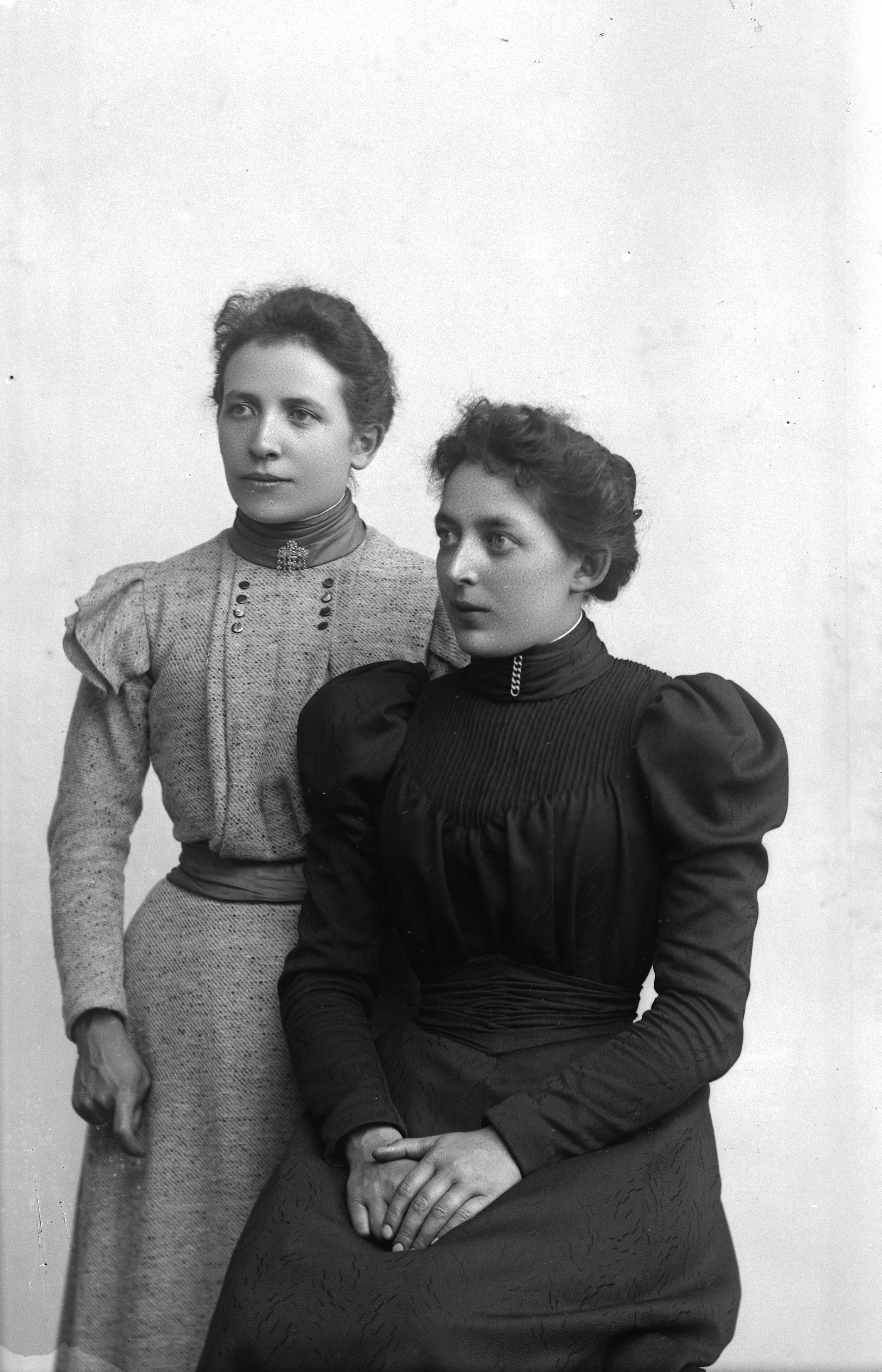 Porträtt i helfigur av Maria Larsson med okänd kvinna, sittande och stående.
