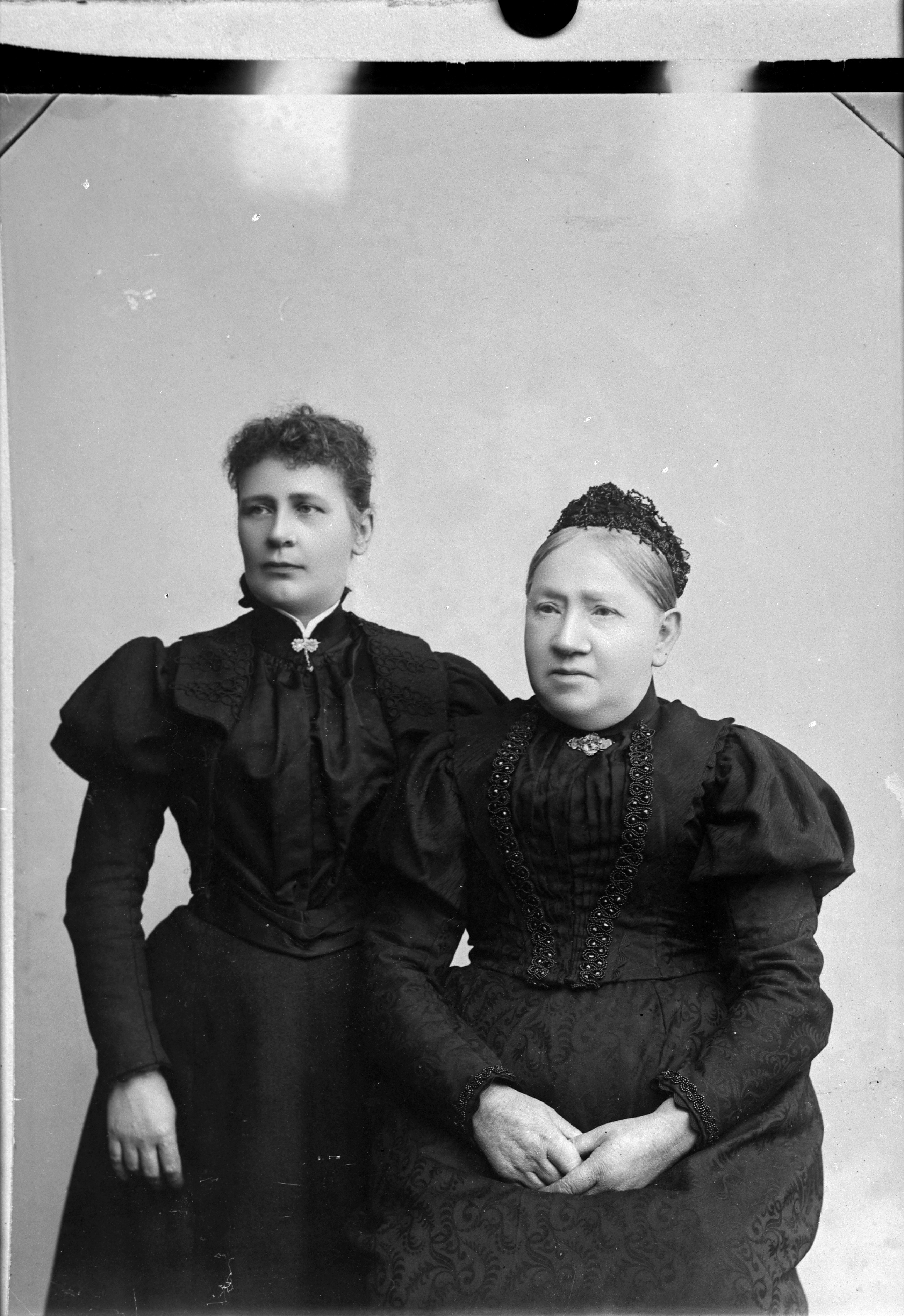 Beskrivning: Porträtt i halvfigur av Hilma Gustava Lejsander vid Rosqvistska Stiftelsen med okänd kvinna.