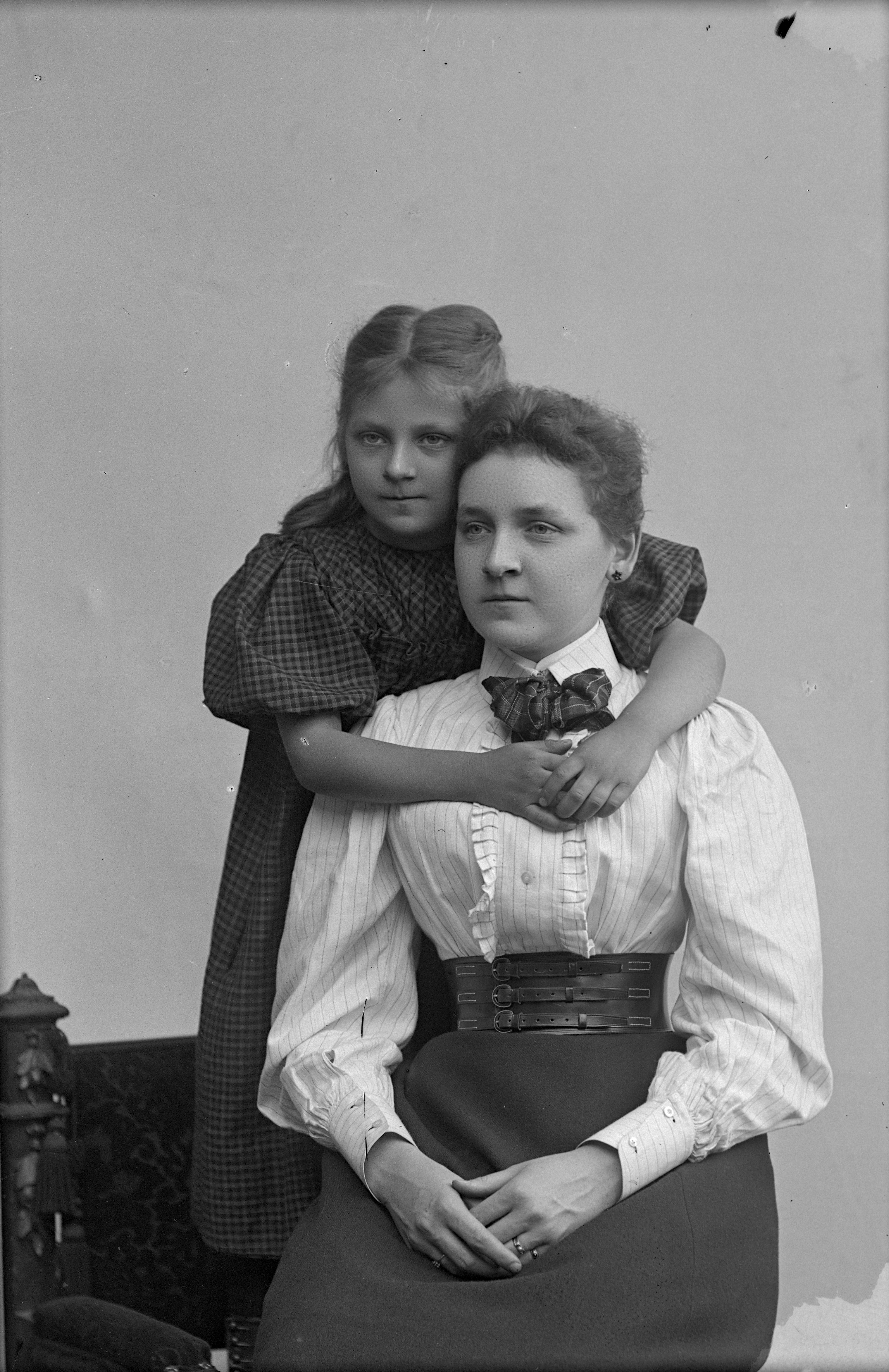 Porträtt i helfigur av Thea Hörup tillsammans med systern Laura. Flickan stående på bänk, hållande armarna runt Thea.