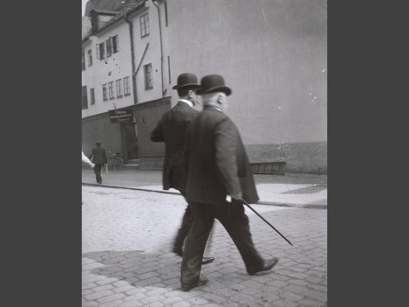 Porträtt, situationsbild av borgmästare Lorens Cronsioe med okänd man gående i gatumiljö.