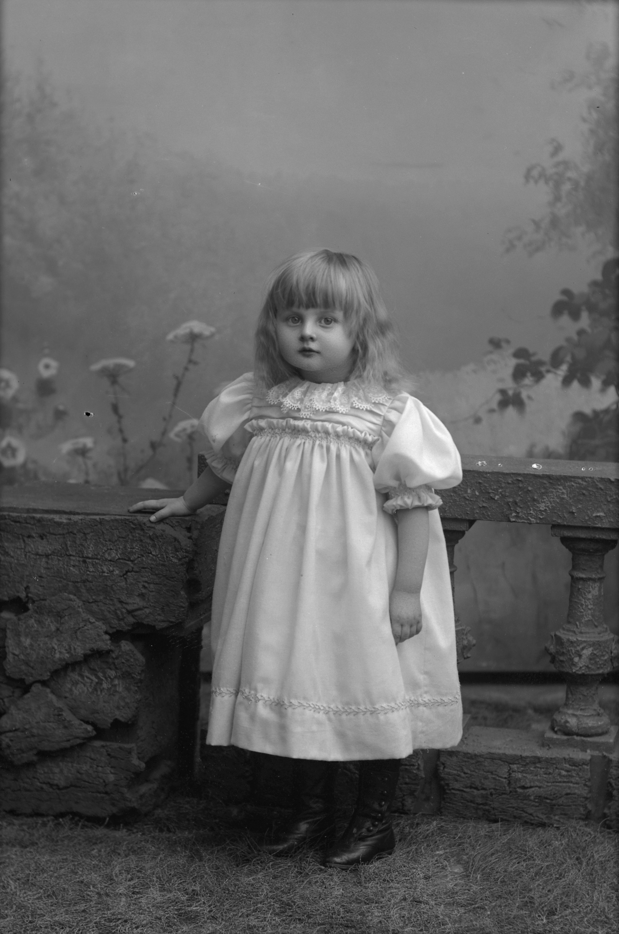 Porträtt i helfigur av von Platens dotter, stående vid stenmur. Ateljéfond med skogs- och blomstermotiv utgör bakgrunden.