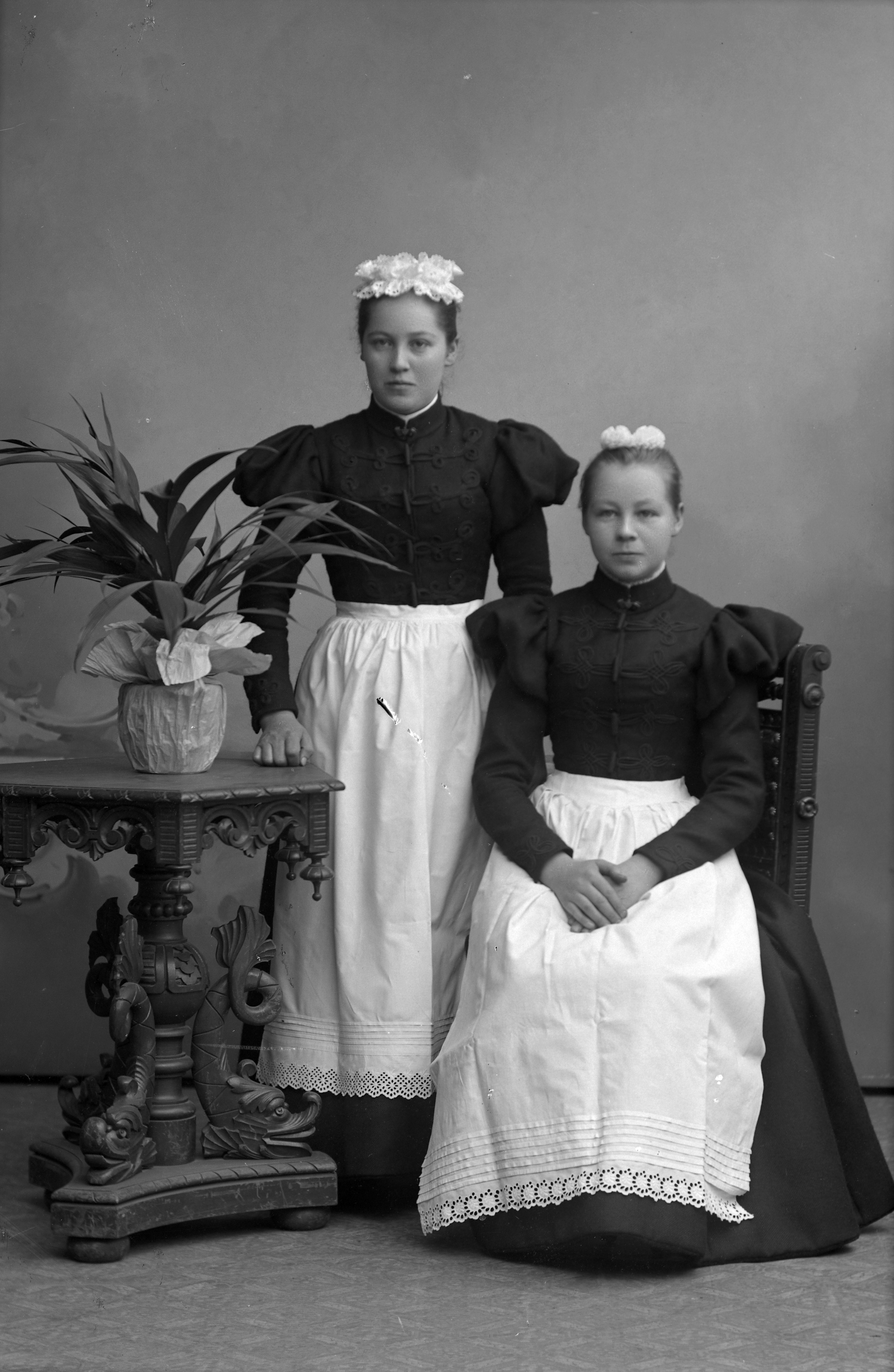 Porträtt i helfigur av Amanda Lundström med okänd kvinna, iklädda förkläden och hättor, möjligen yrkesklädesel. En av kvinnorna stående vid kulpterat pelarbord, med stor krukväxt /Västergatan.
