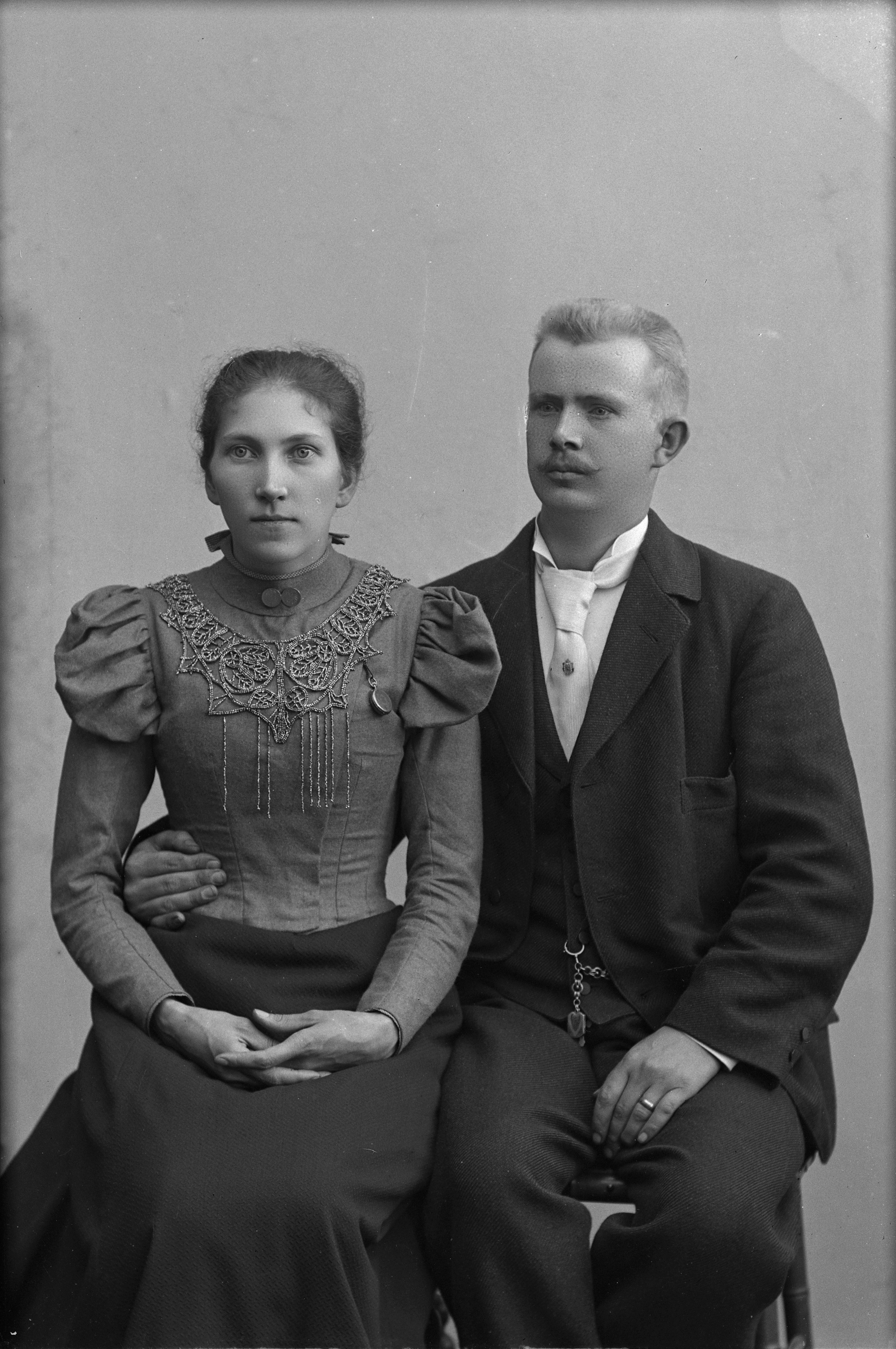 Beskrivning: Porträtt i helfigur av J. Johansson med fru.