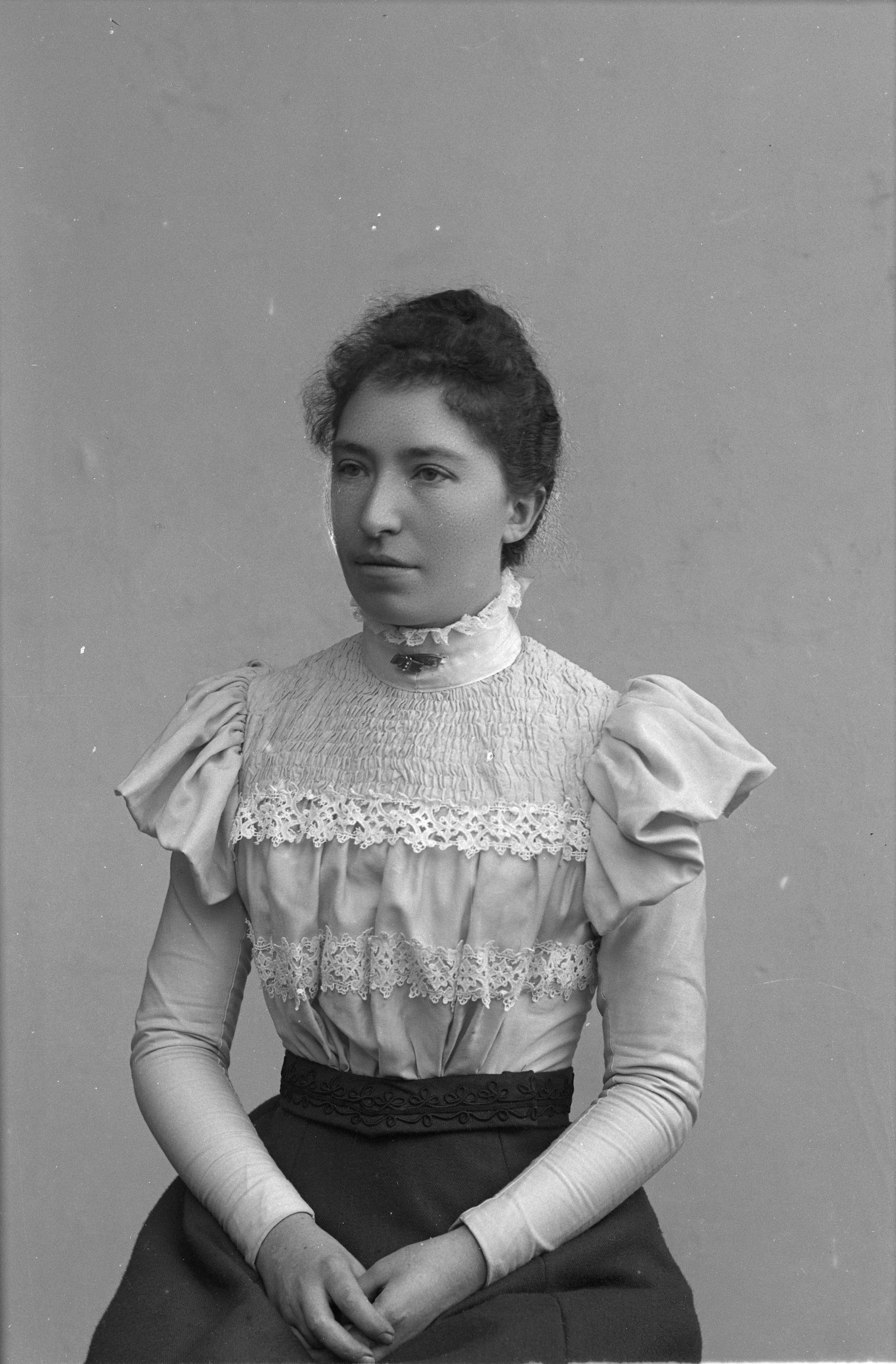 Beskrivning: Porträtt i halvfigur av Elin Nilsson.