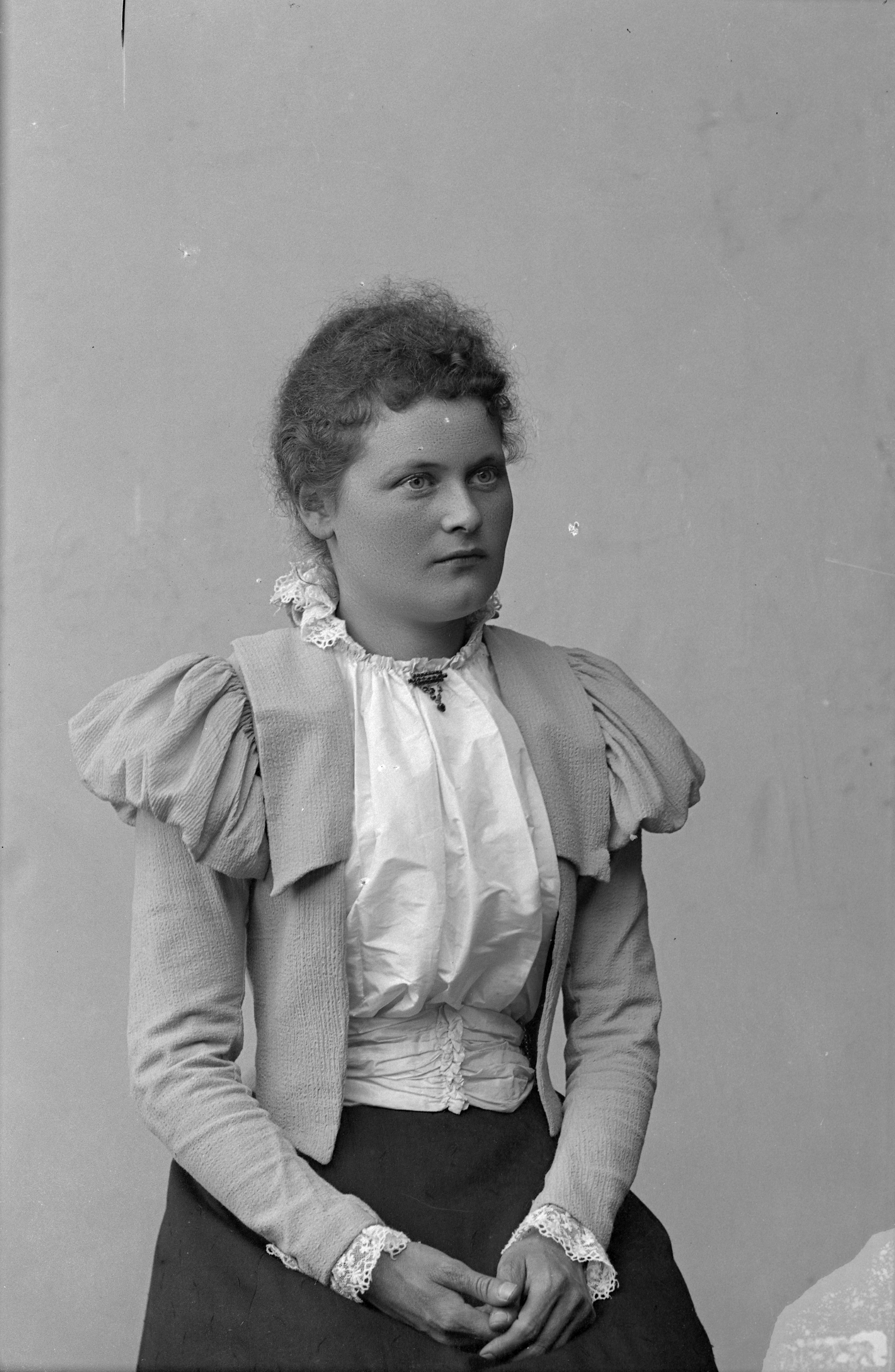 Beskrivning: Porträtt i halvfigur av Clara Holmberg i Håslöv.