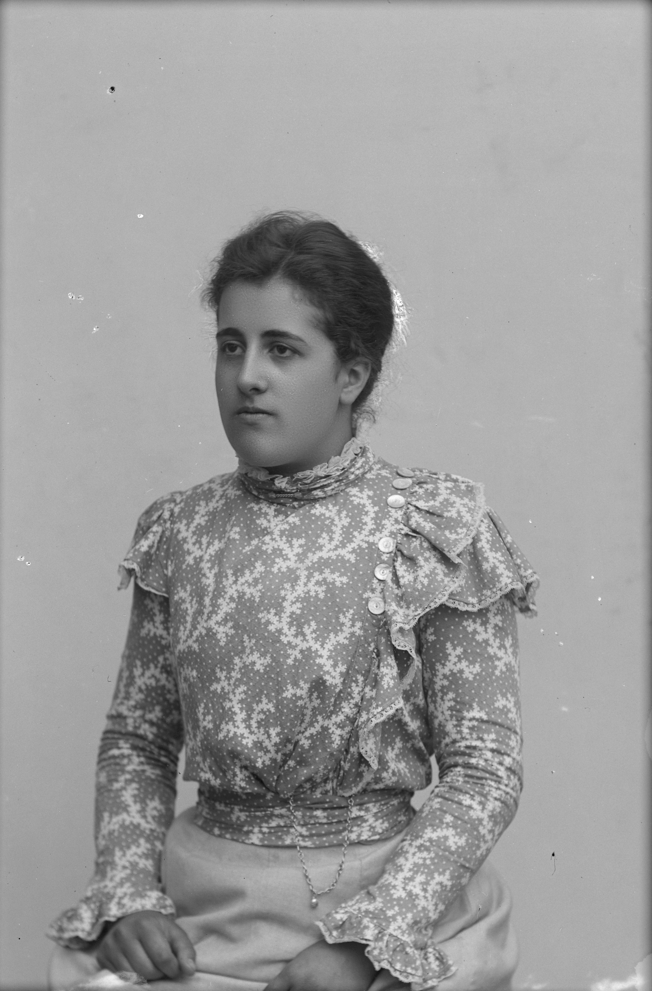 Beskrivning: Porträtt i halvfigur av fröken Bonneville.
