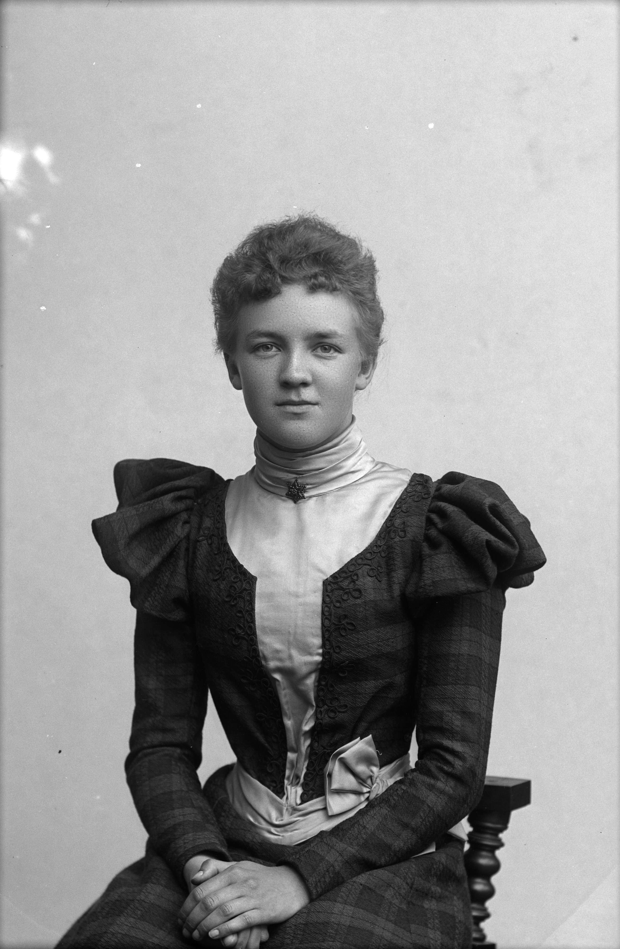 Beskrivning: Porträtt i halvfigur av fröken Sahlin /Eslöv.
