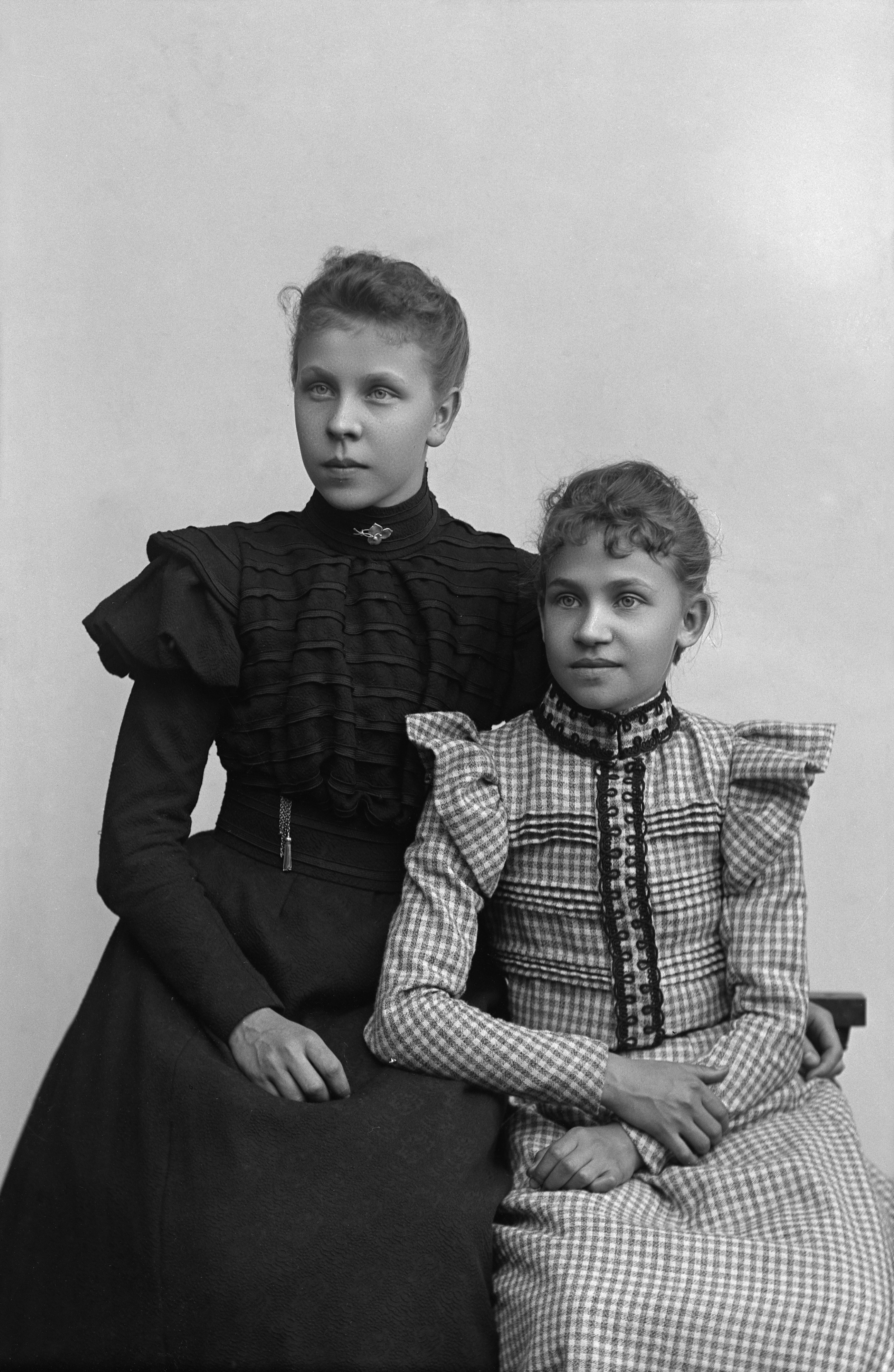 Porträtt i helfigur av Anna Norling med okänd kvinna, sittande och stående.