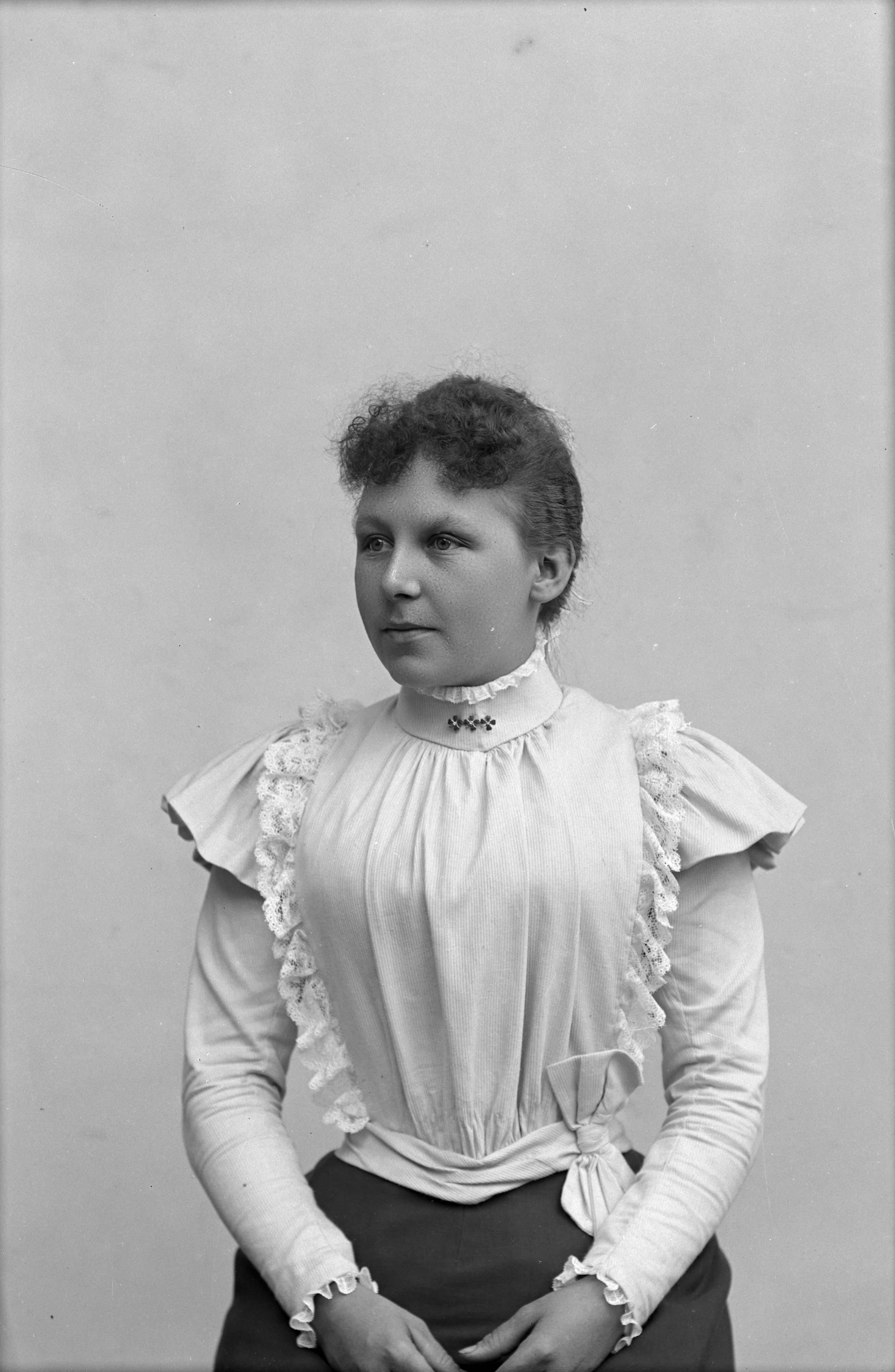 Beskrivning: Porträtt i halvfigur av Hilda Nilsson.