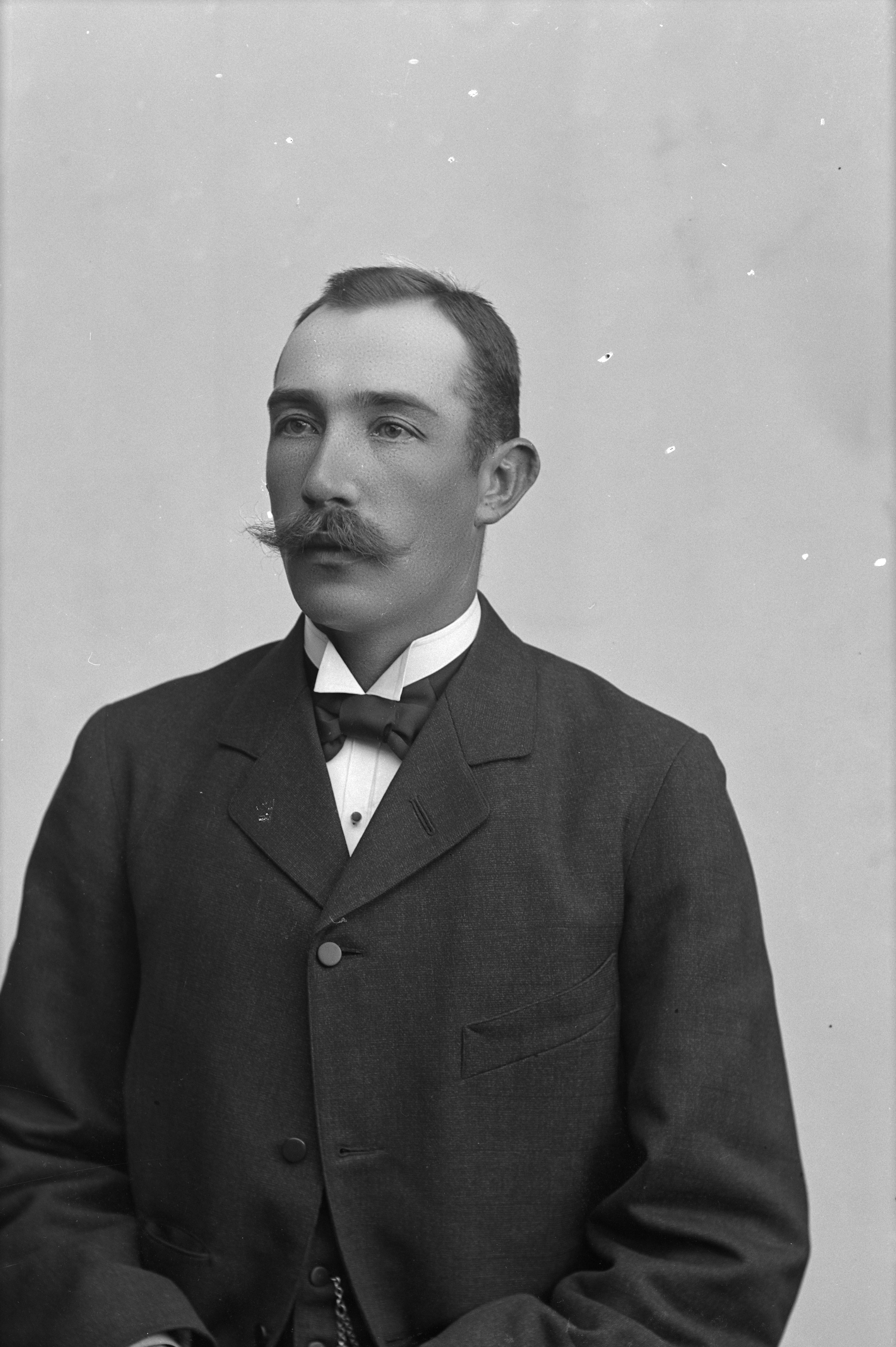 Beskrivning: Porträtt i halvfigur av G. Alm.