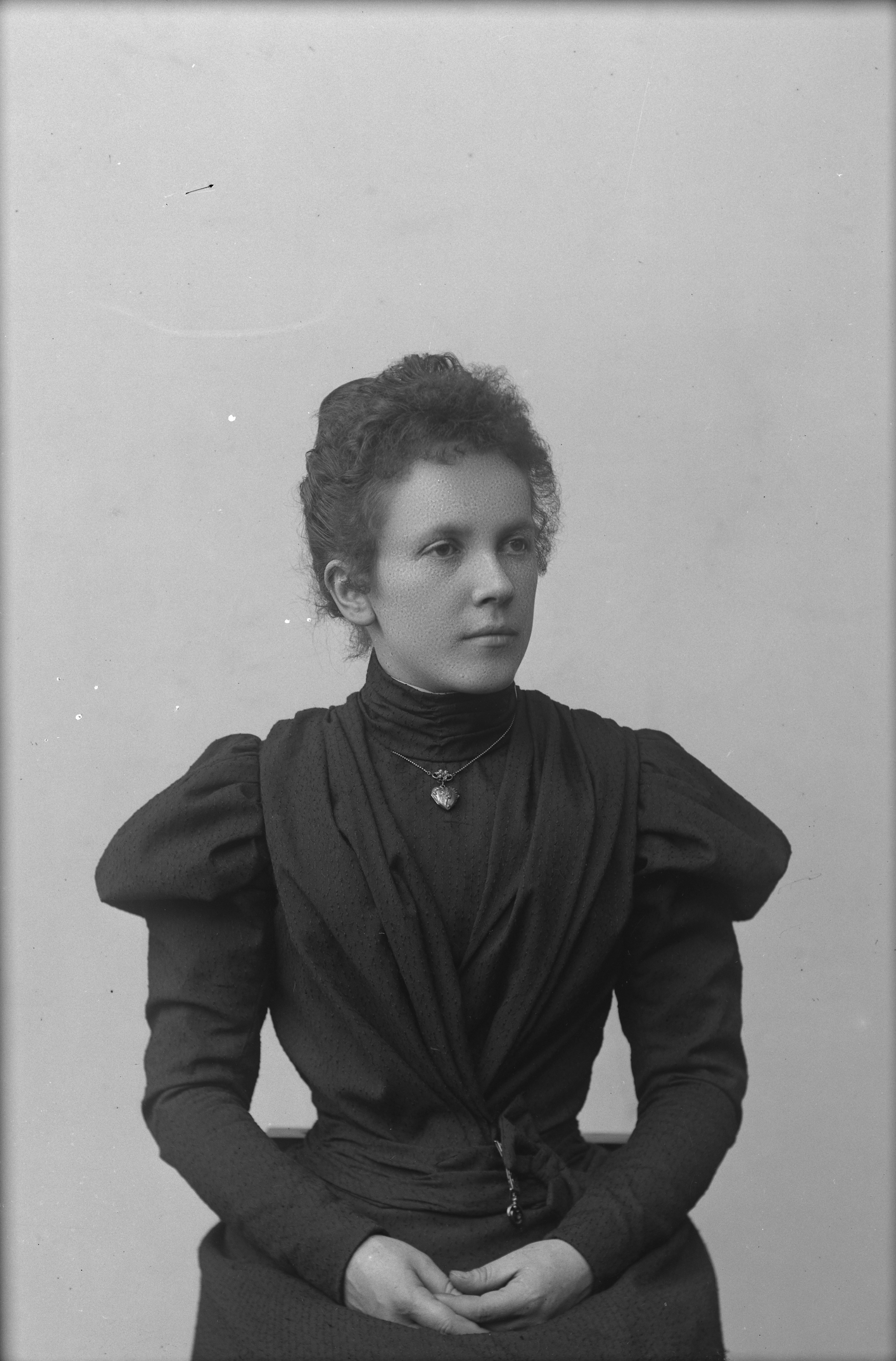 Beskrivning: Porträtt i halvfigur av Elin Nilsson i Lövestad.