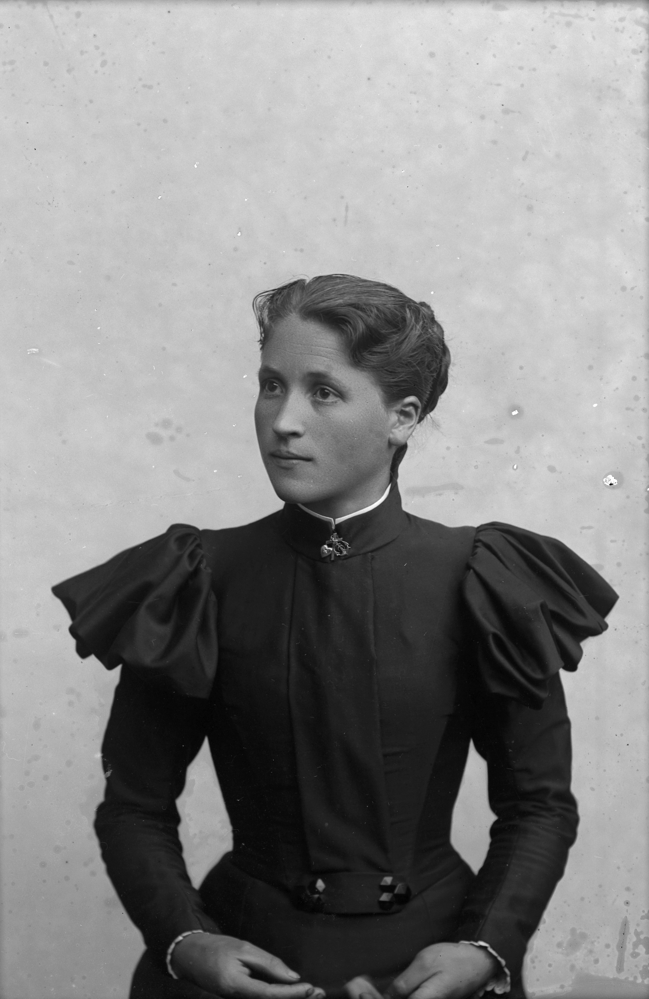 Beskrivning: Porträtt i halvfigur av Alma Gustafsson.