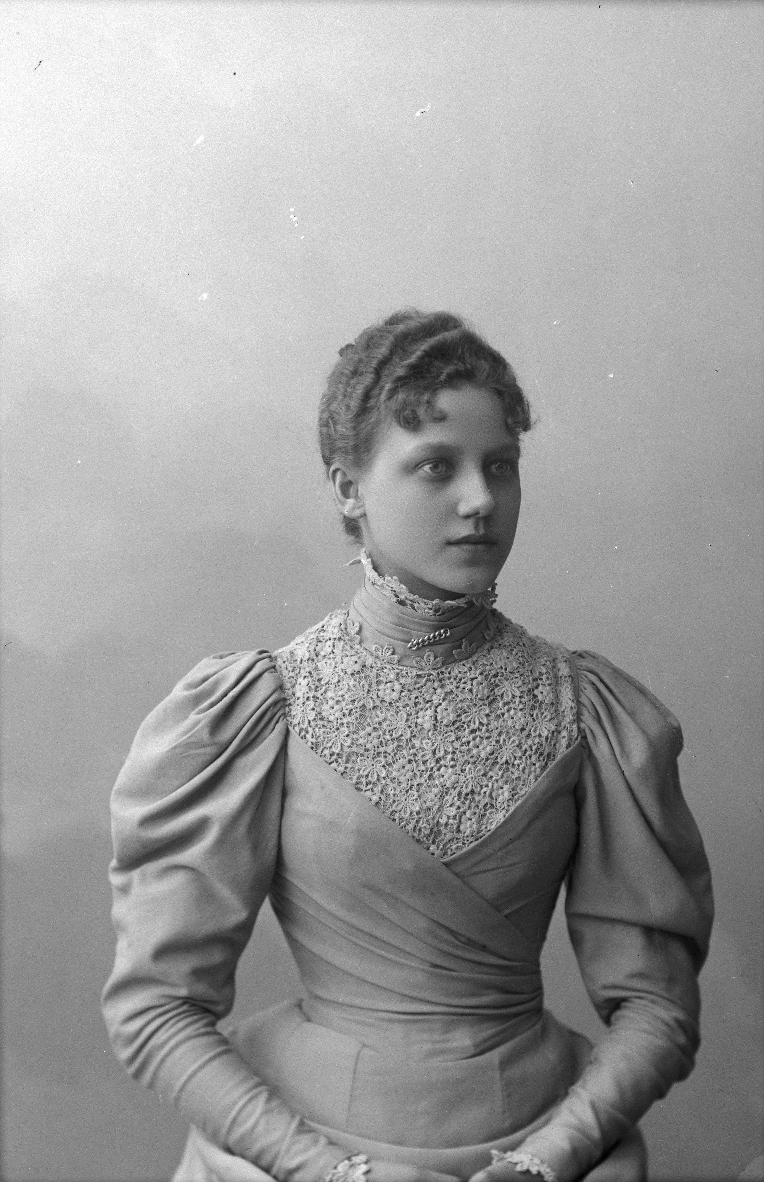 Beskrivning: Porträtt i halvfigur av Elfrida Nilsson.