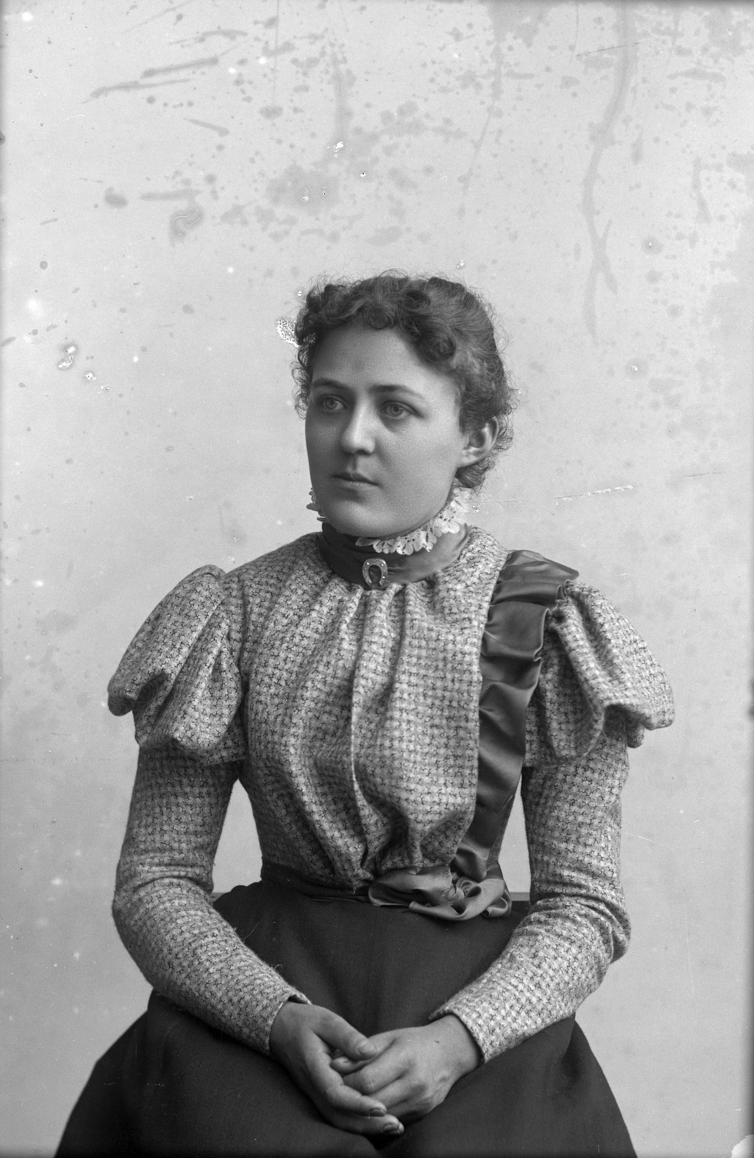 Beskrivning: Porträtt i halvfigur av Alma Lundin.