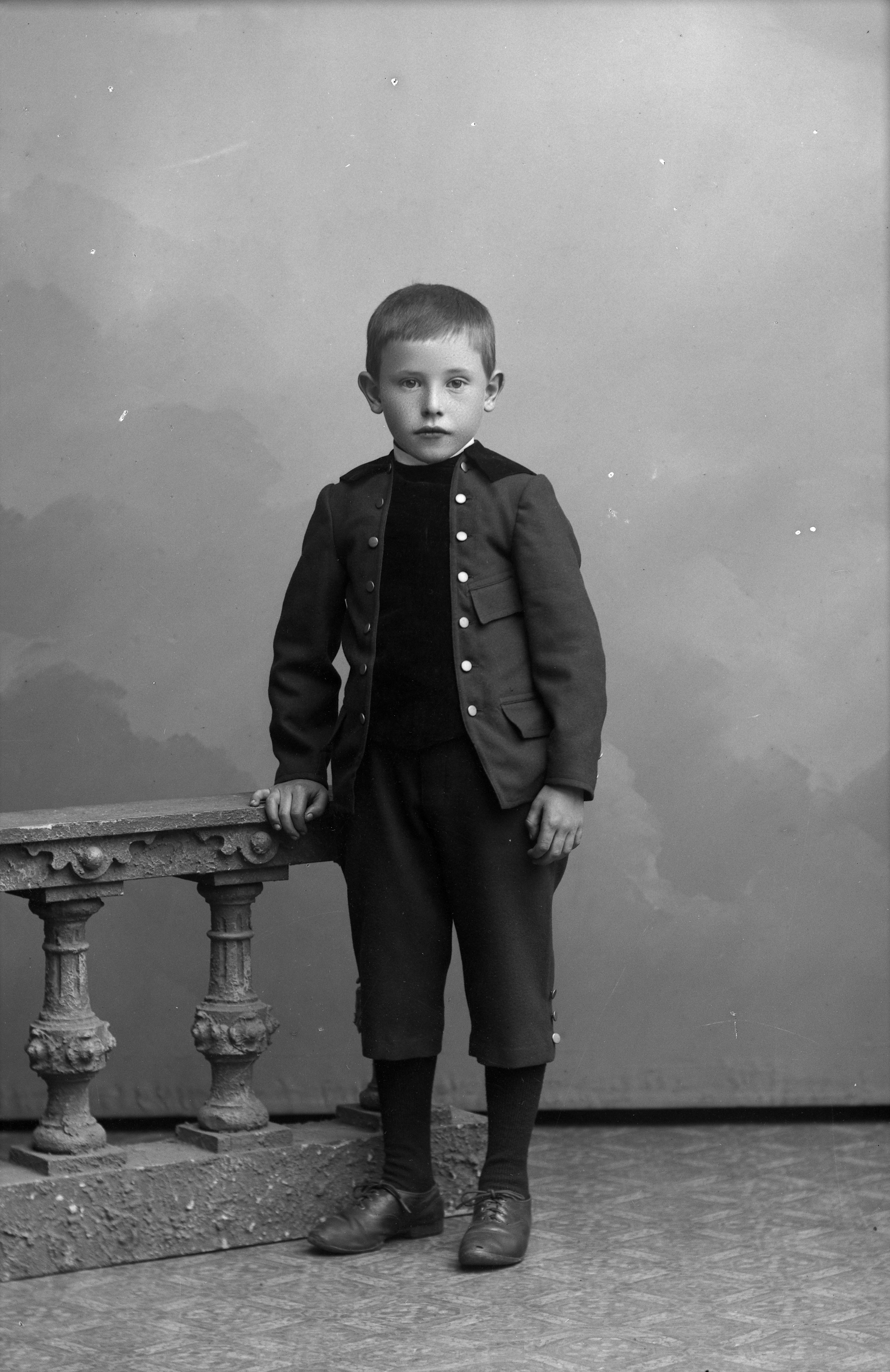 Porträtt i helfigur av Perssons son, stående vid stenstaket med balustrad.