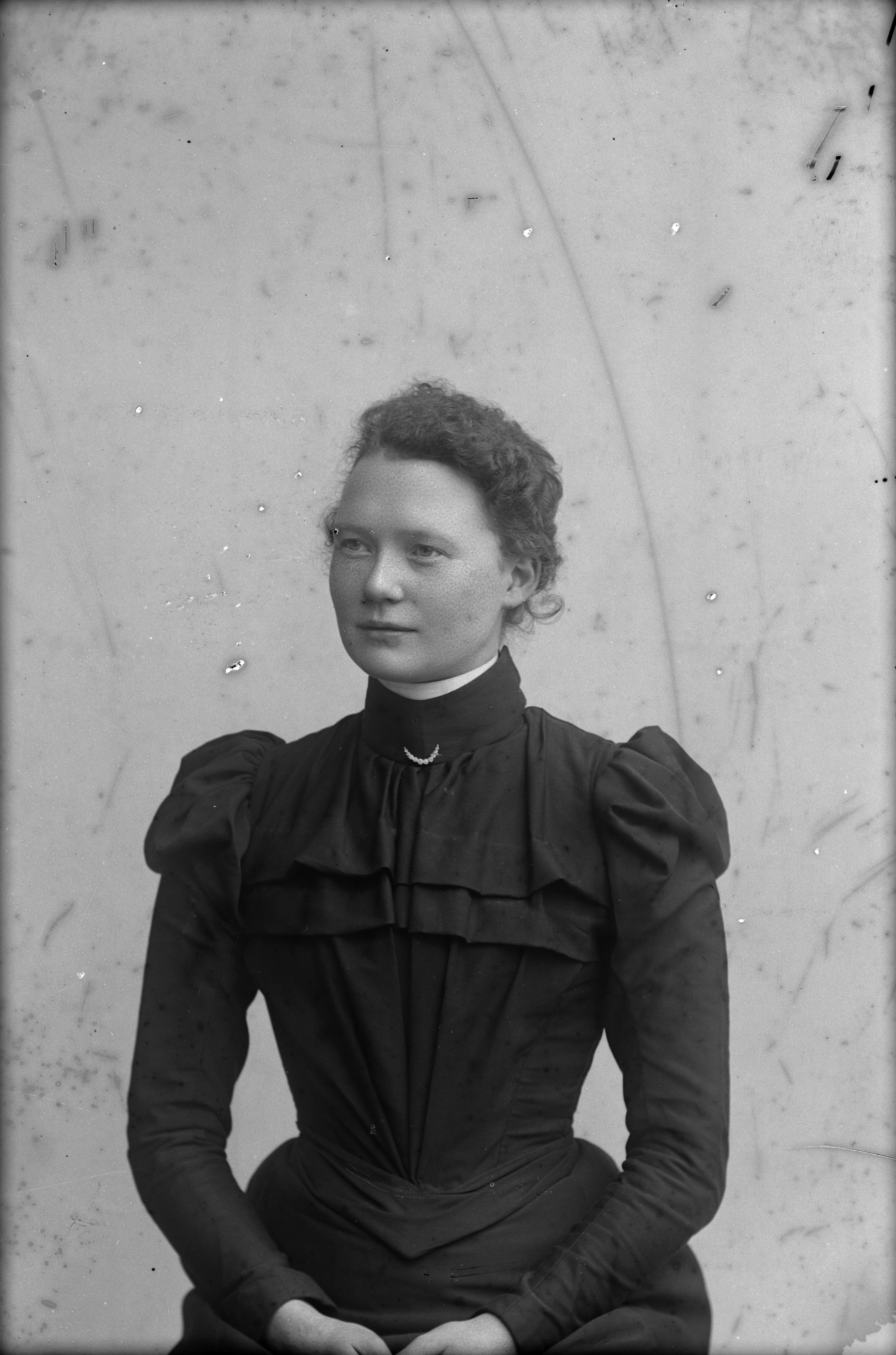 Beskrivning: Porträtt i halvfigur av Sigrid Svensson /Djäknegatan.