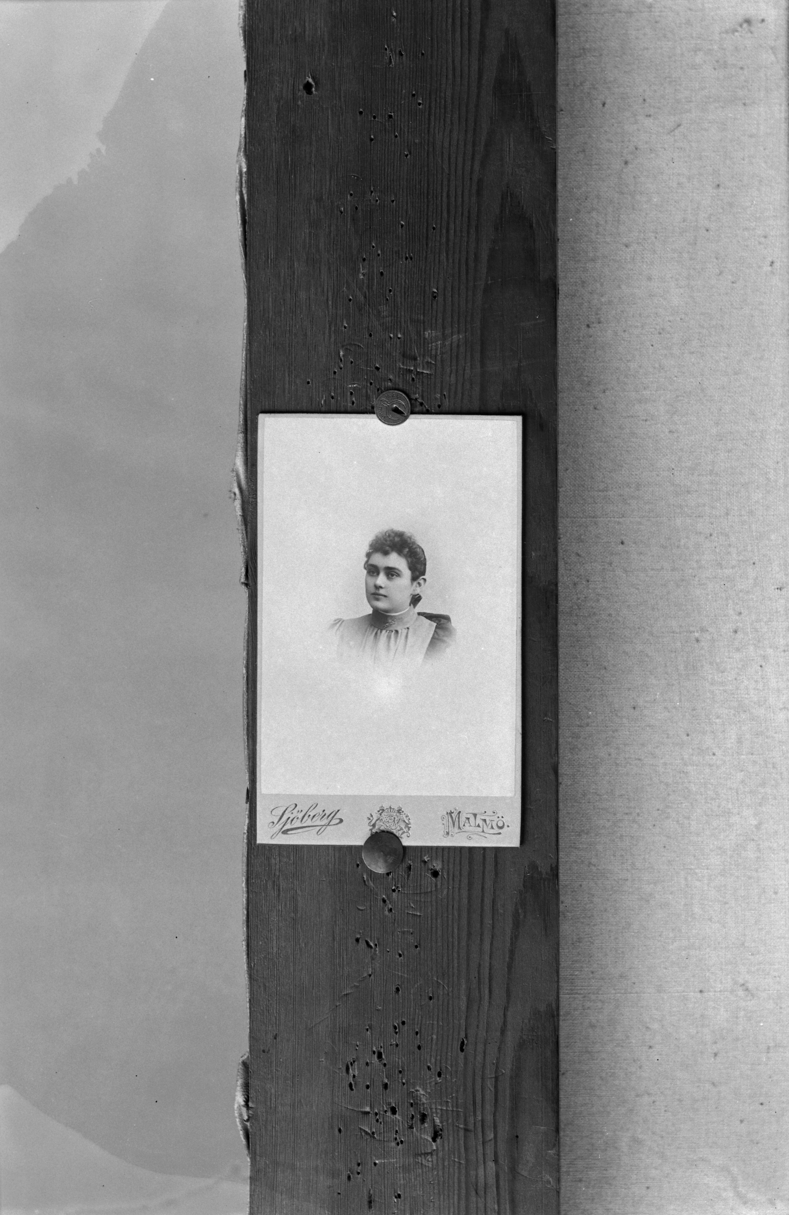 Beskrivning: Porträtt i halvfigur av fröken Anderberg. Visitkort med ateljélogotyp "Sjöberg /Malmö".