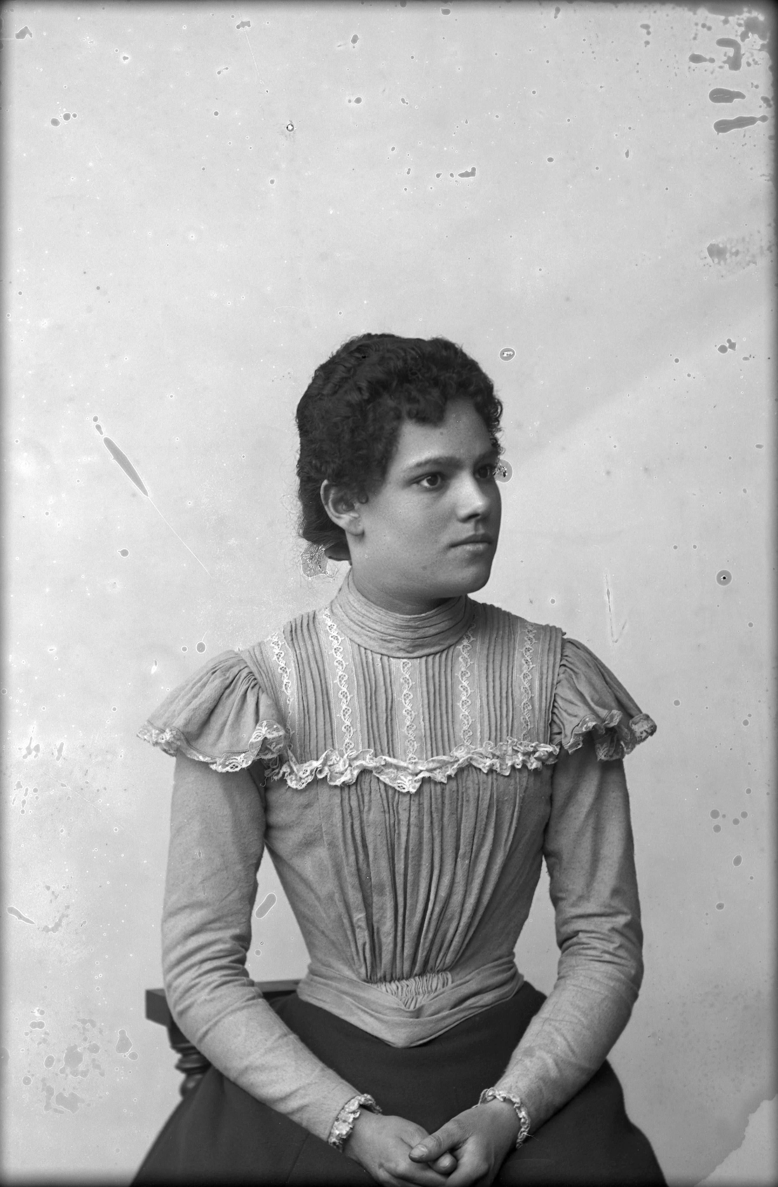 Beskrivning: Porträtt i halvfigur av Anna Jensen.