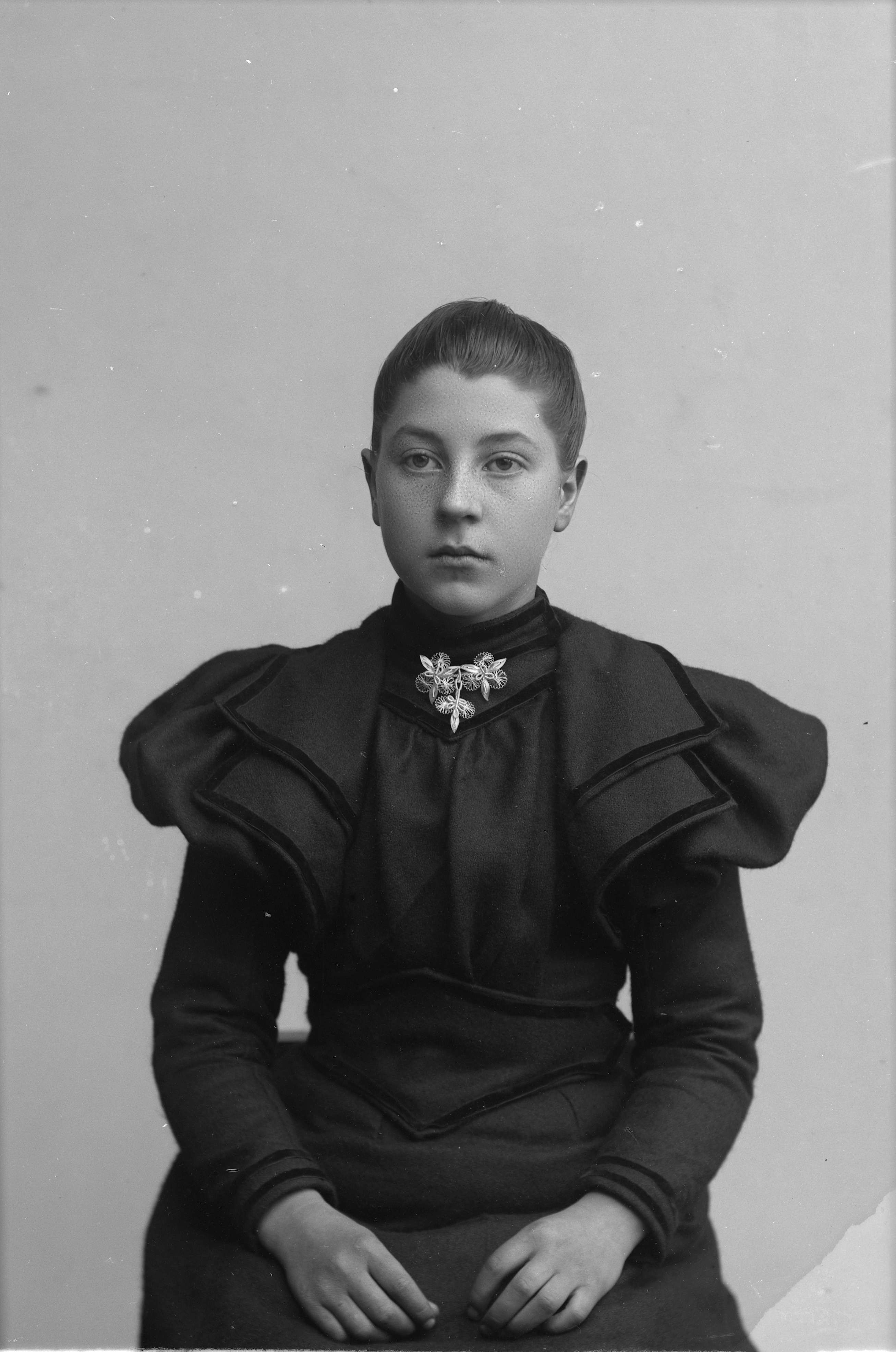 Beskrivning: Porträtt i halvfigur av Selma Persson.