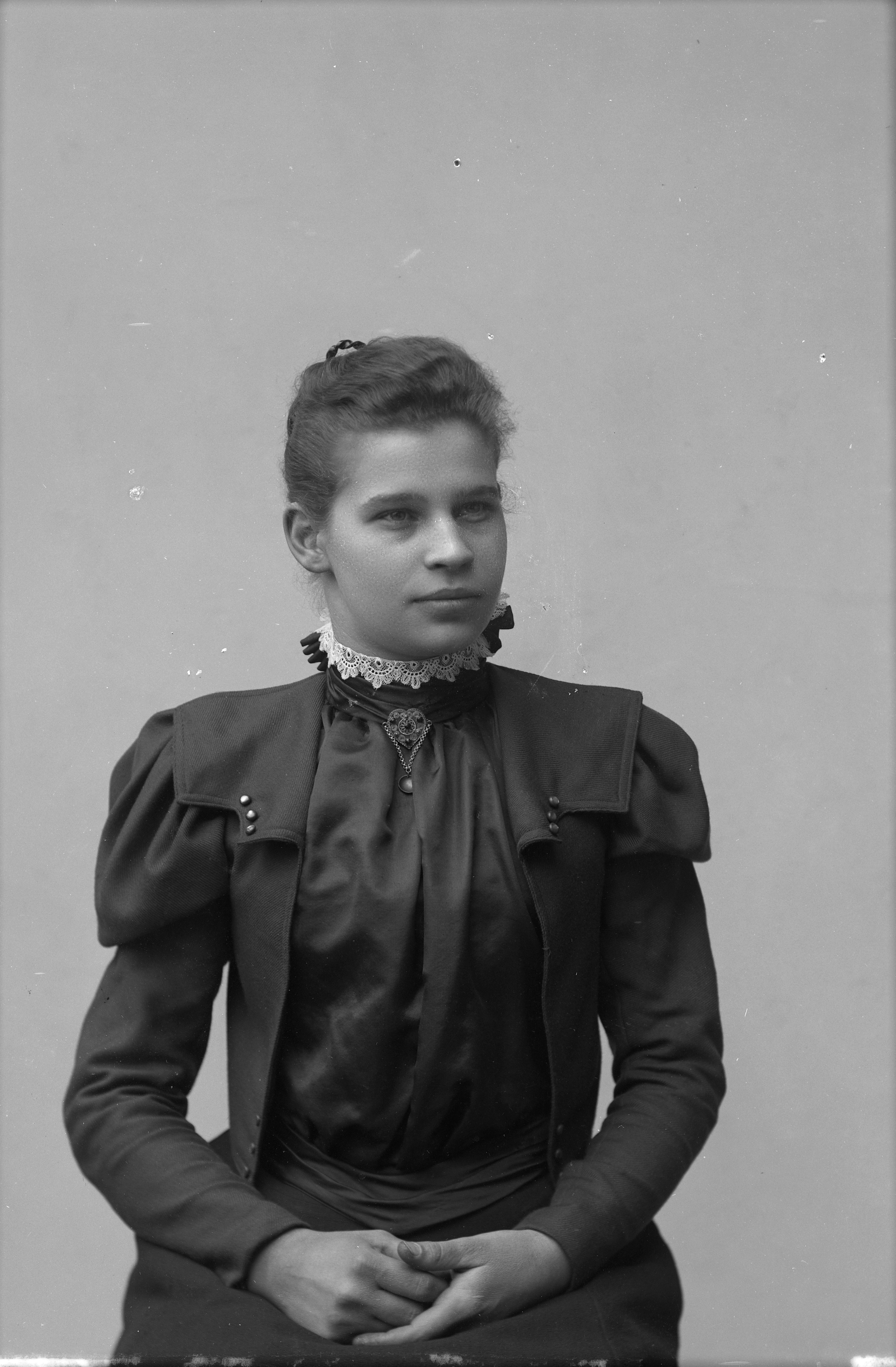 Beskrivning: Porträtt i halvfigur av Lydia Nilsson.