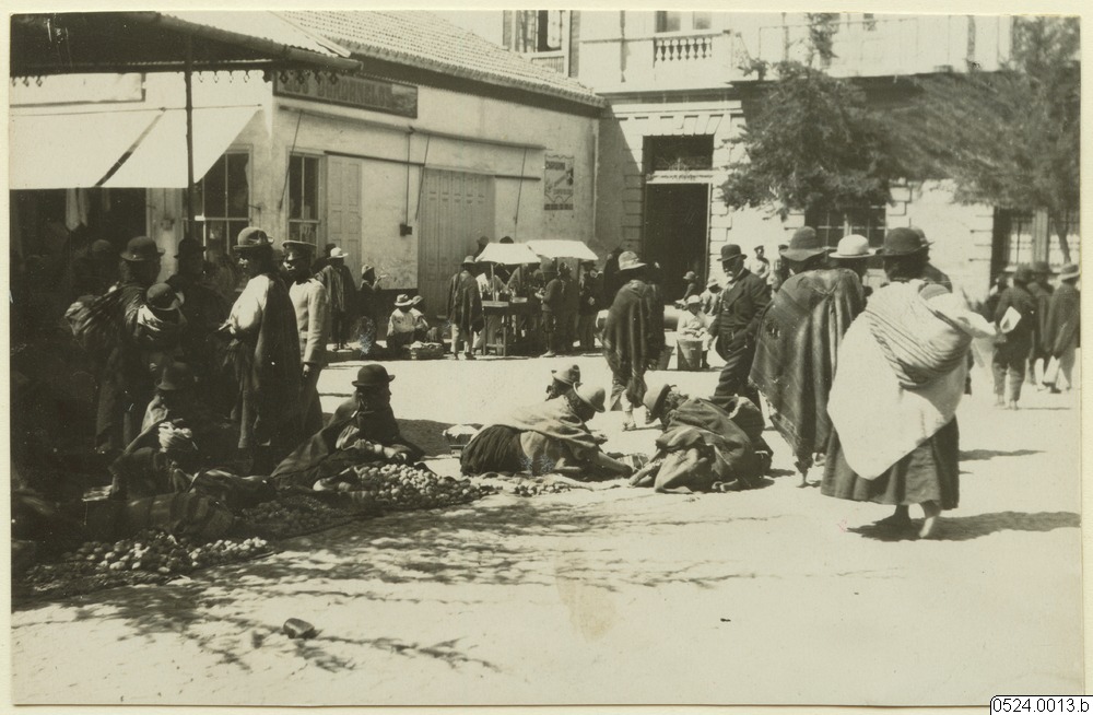 Från saluplatsen framför Iglesia de San Francisko. I förgrunden skor, som sälja "chunos", potatis, ordnade i högar på fem stycken i varje hög. Borta i hörnet synas män samlade kring ett stånd där framförallt tuggat majsöl försäljes, " lgl de S.F. är den speciella kyrkan.
