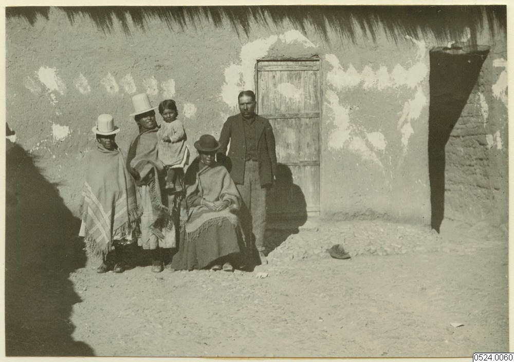 Cholo-familj, som vi först bodde hos i Ulloma. Husfadern är cholo, hustrun indianska och har som sådan en mörk, mjuk filthatt. Döttrarna äro i egenskap av avkomlingar av en cholo och en indianska däremot cholas och sålunda mycket finare än sin mamma. De ha även som tecken på sin värdighet de för cholas karakteristiska vita, styva skorstenshattarna.
