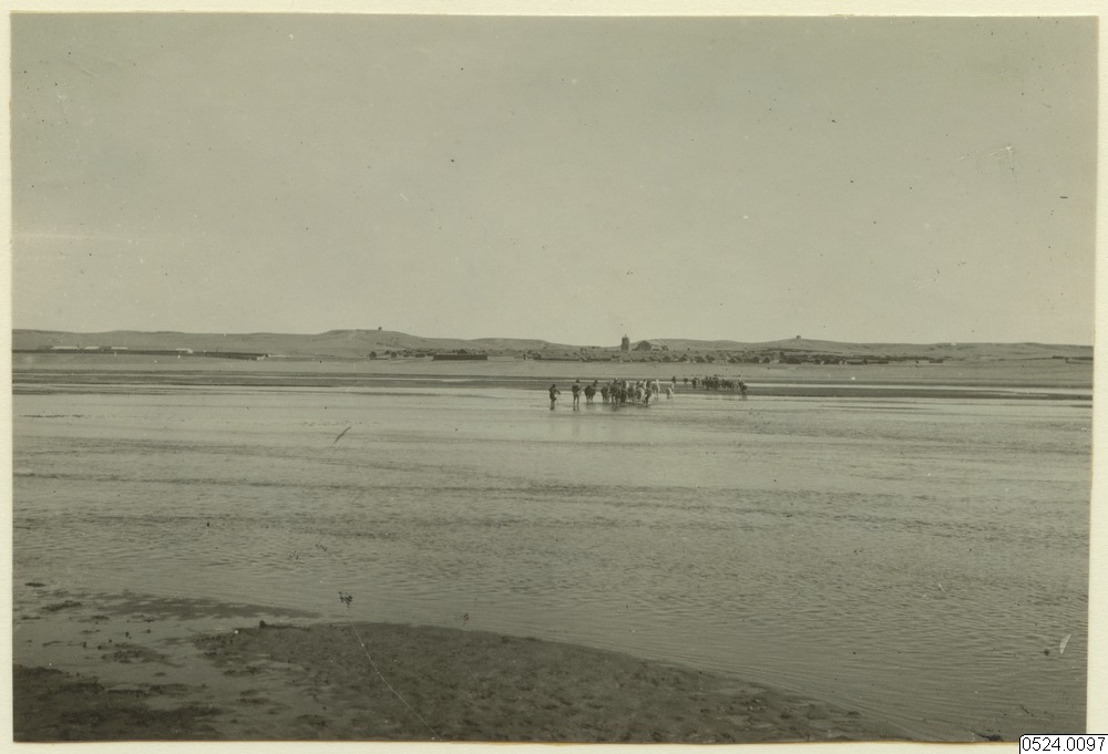 En lamadjurskaravan drives över Rio Mauri. Det djupare partiet av flodens är redan passerat och en del av djuren ha redan kommit över till norra stranden där den lilla byns, Calacoto, grå lerhus skymta. På sandhöjderna i bakgrunden synas i tornform uppförda vägvisare.