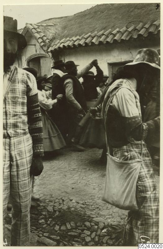 Från Corocoro under "La gran fiesta del carnaval". I förgrunden stå ett par vederbörligt utklädd oholos, av vilka mannen till höger bär en påse med mjölprojektiler. Båda ha på sig armmuddar av imiterade ursprungsbefolkningens vävnader. I bakgrunden synes långdans, där just en kvinna dansar runt, under den manlige beskyddarens utsträckta arm. Framför en byggnad.