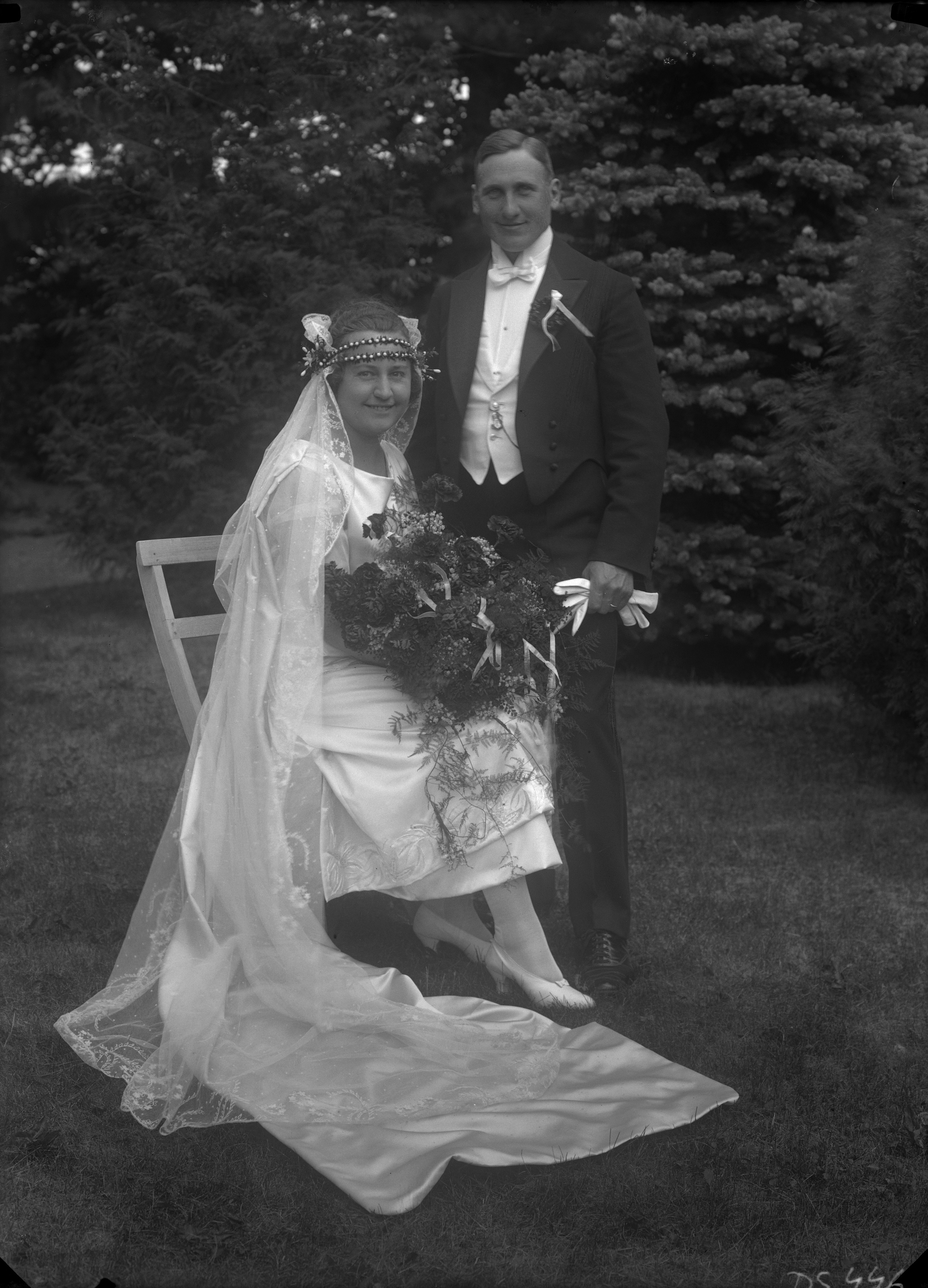 "And. O. Olsson." Brudpar exteriör, trädgård.