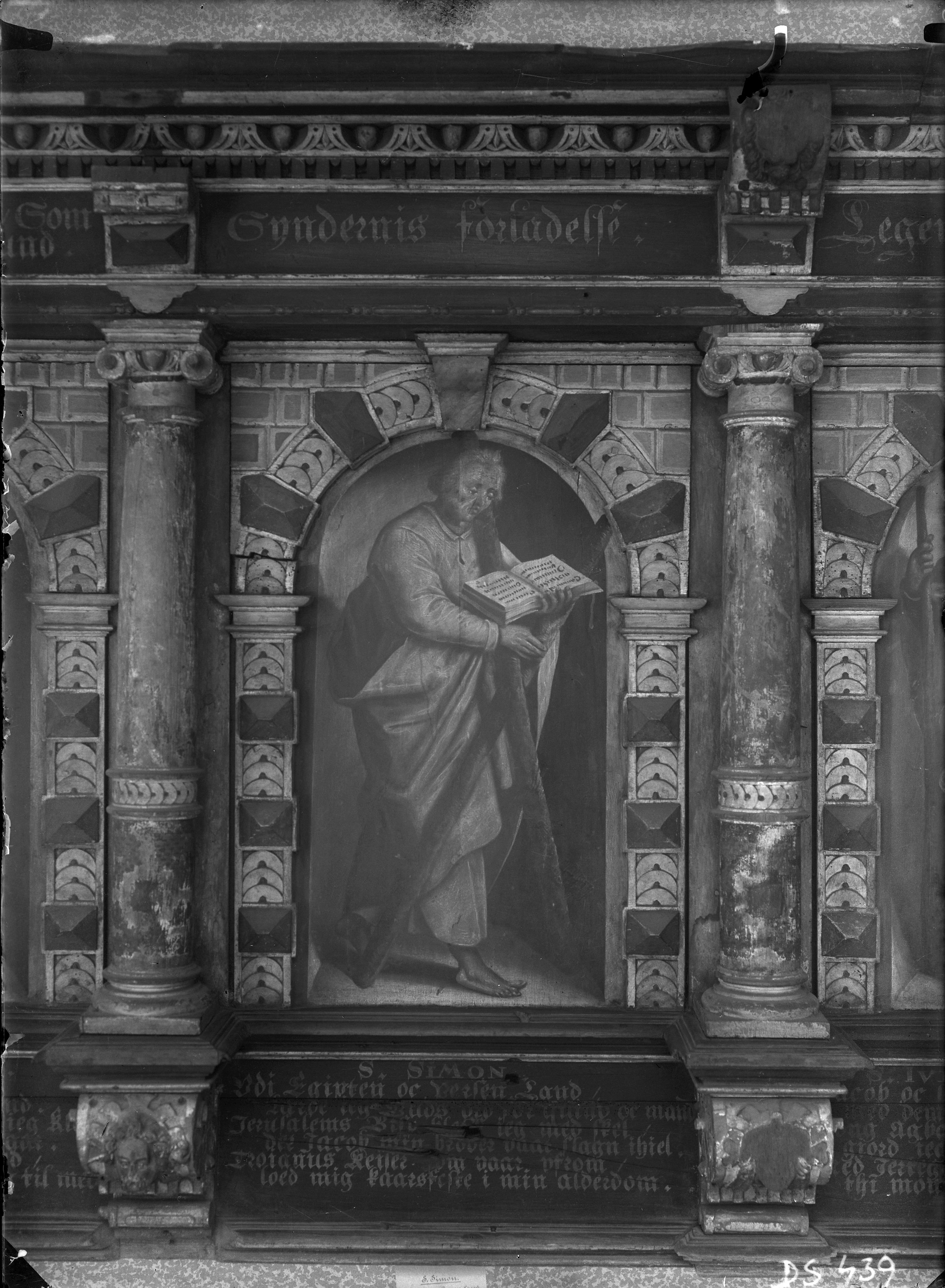 Beskrivning: Kyrkointeriör målning av S. Simon.