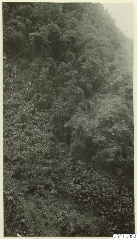 Parti av tropisk regnskog vid Rio Chungamayos branta stränder. Den tropiska regnskogen täcker såsom ett grönt, luddigt överdrag bergssluttningen. De olika växterna bilda liksom en sammanhängande väv, då man ej kan urskilja de olika träden utan endast skönja bladverk och blommor, trädstammar och lianer, utan att begränsa dem i förhållande till varandra.