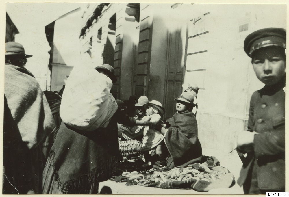 Ung aymara-kvinna med sin något fetlagda unge. Den unga modern har, som synes, milda och långt ifrån oävna anletsdrag. Den bakom sittande till fullt mogen ålder komma kvinnliga representanten för aymarafolket har däremot redan framskjutande käkparti och kindkotor, varjämte hennes i ungdomen ljusa hy alltmer antagit samma färgton som en väl rostad kaffeböna. På den utbredda filten ligga "chochos", majskolvar, vilka ätas kokta med salt.