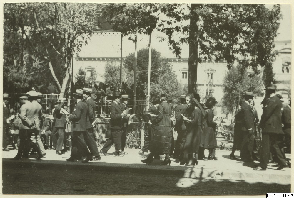 "Från plaza-promenaden i La Paz vid regementmusikens toner på en söndags-middag. De promenerande går i stor utsträckning och läsa tidningar, en sedvänja, vars uppkomst är svår att förklara. Malisen påstår, att de läskunniga på detta sätt vilja visa att de äro hemma i denna civilisationens svåra konst, men det kan ju ej vara sant".