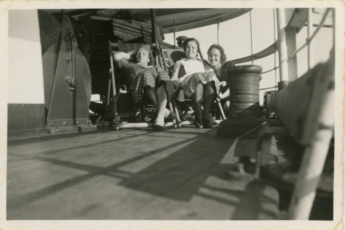 Erna Luther (i mitten) var stewardess på Estonia. På fotografiet sitter Erna på däck tillsammans med två arbetskamrater 1939 (möjligen 1938).