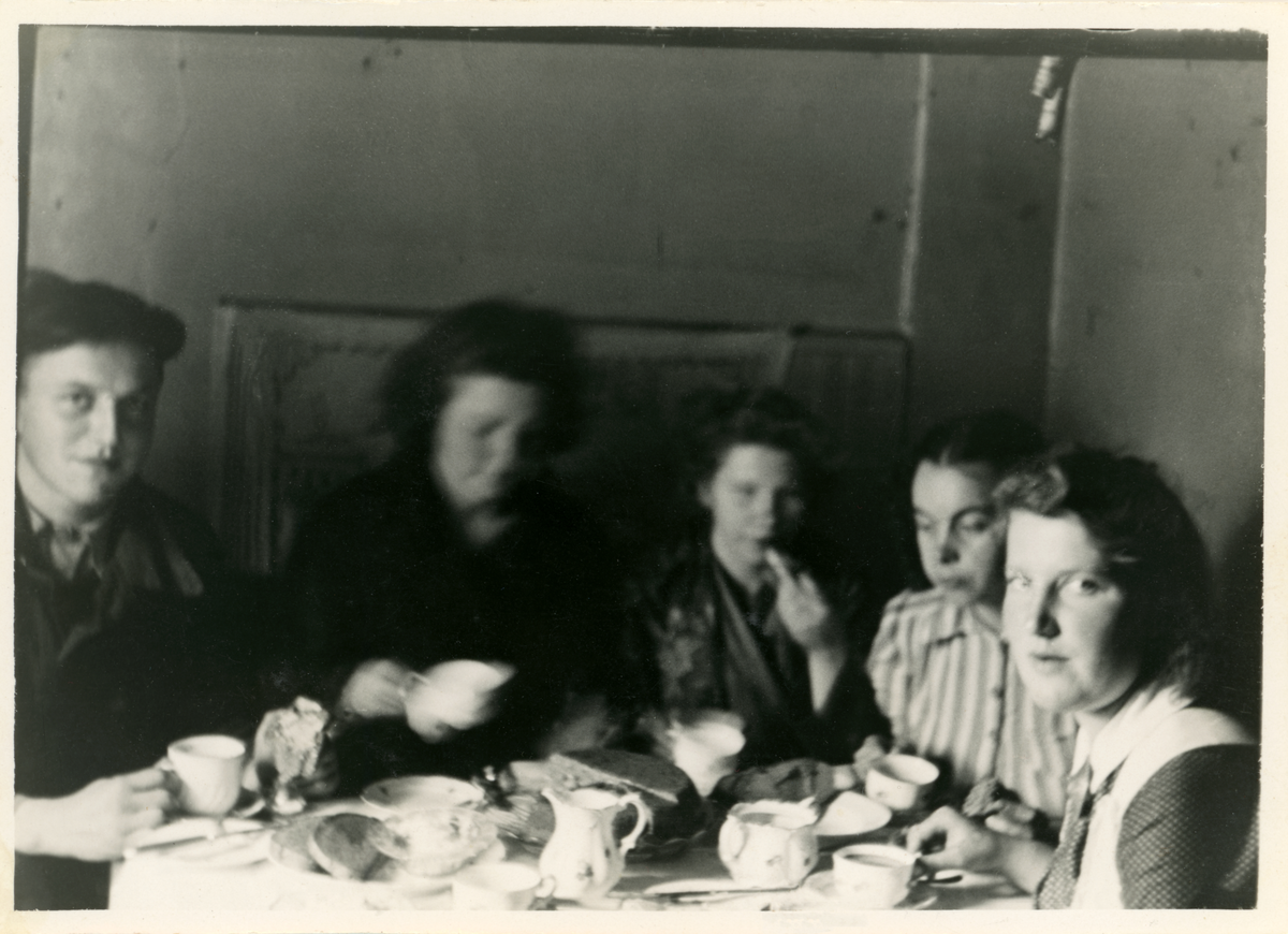 Syskonen Luther bjuder två väninnor på kaffe, mellan återflytten till Nargö 1941 och flykten därifrån 1943. Från vänster Evald, Erna, två väninnor och längst till höger Linda. Gräddsnipan, sockerskålen och några koppar ur servisen syns på kaffebordet.