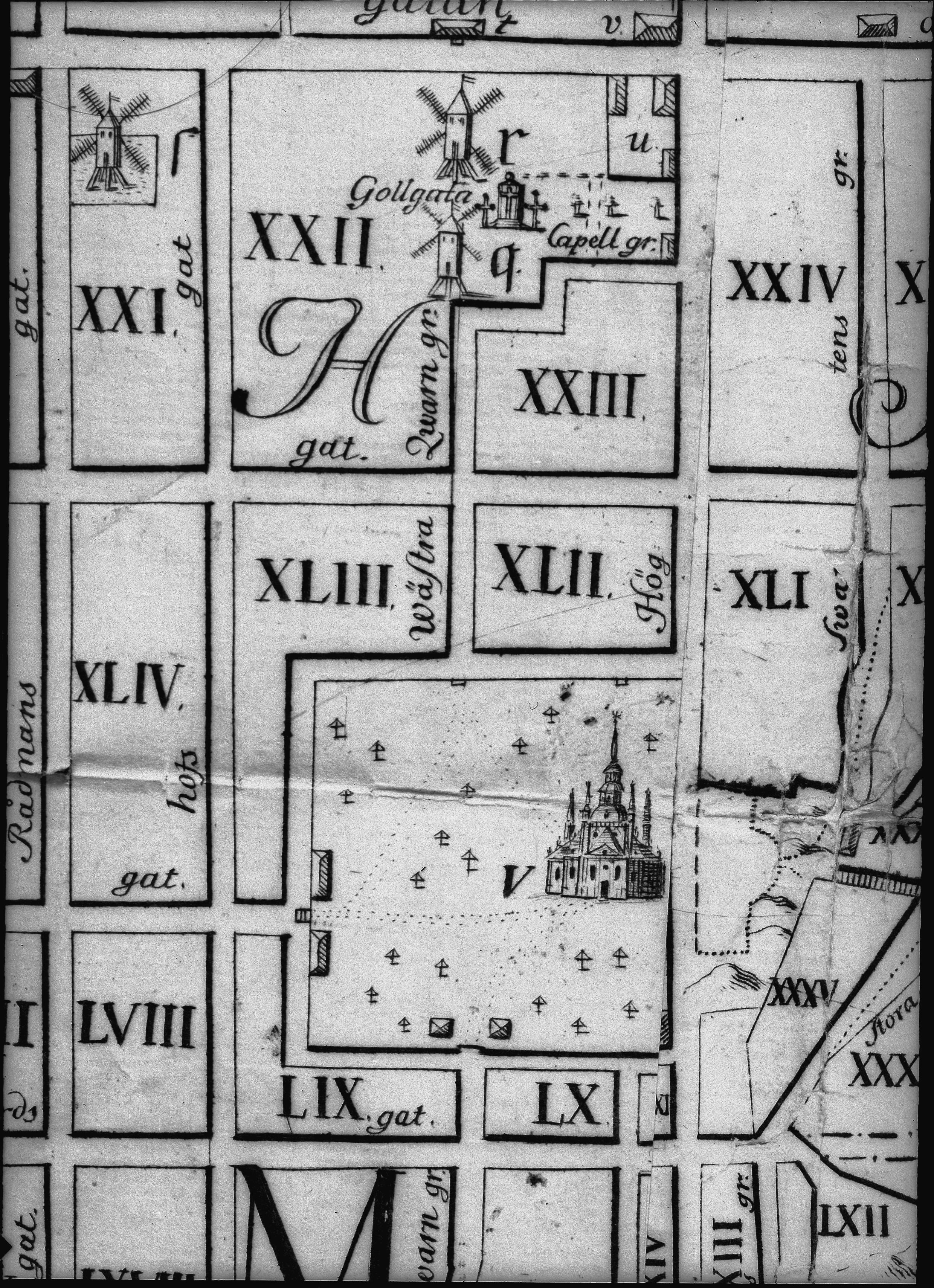 Karta över Katarina kyrka och Pelarbacken, efter P. Tilleus karta över Stockholm. Original i Rosenhanska samlingen, ATA, avfotograferad.