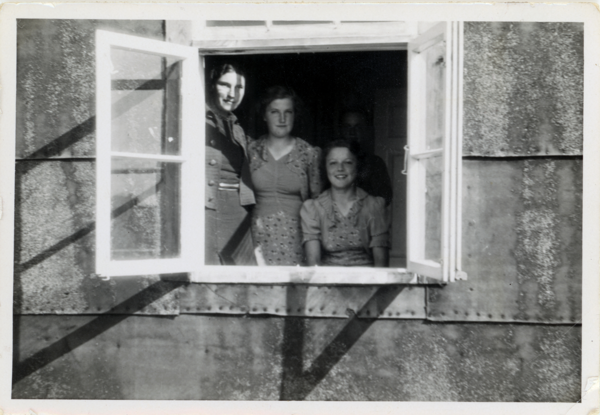 I det öppna fönstret syns Erna Luther längst till höger. Bredvid henne står Linda Luther och till vänster väninnan Ellen Kallas.