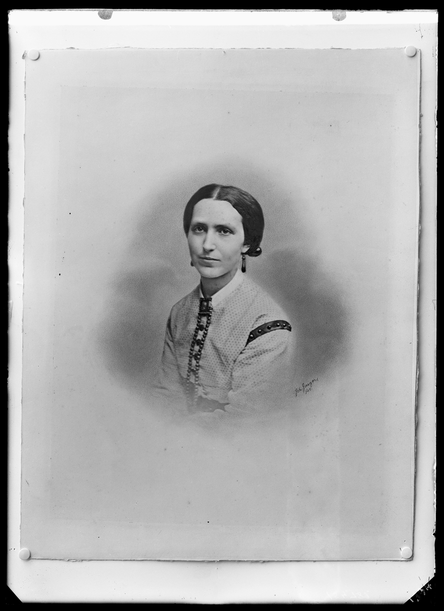 Reprofotografi av Sofi Hazelius. Porträtt, bröstbild. Sofi Hazelius med mittbena, prickig kläning med ståkrage och smycken, troligen av stenkol.