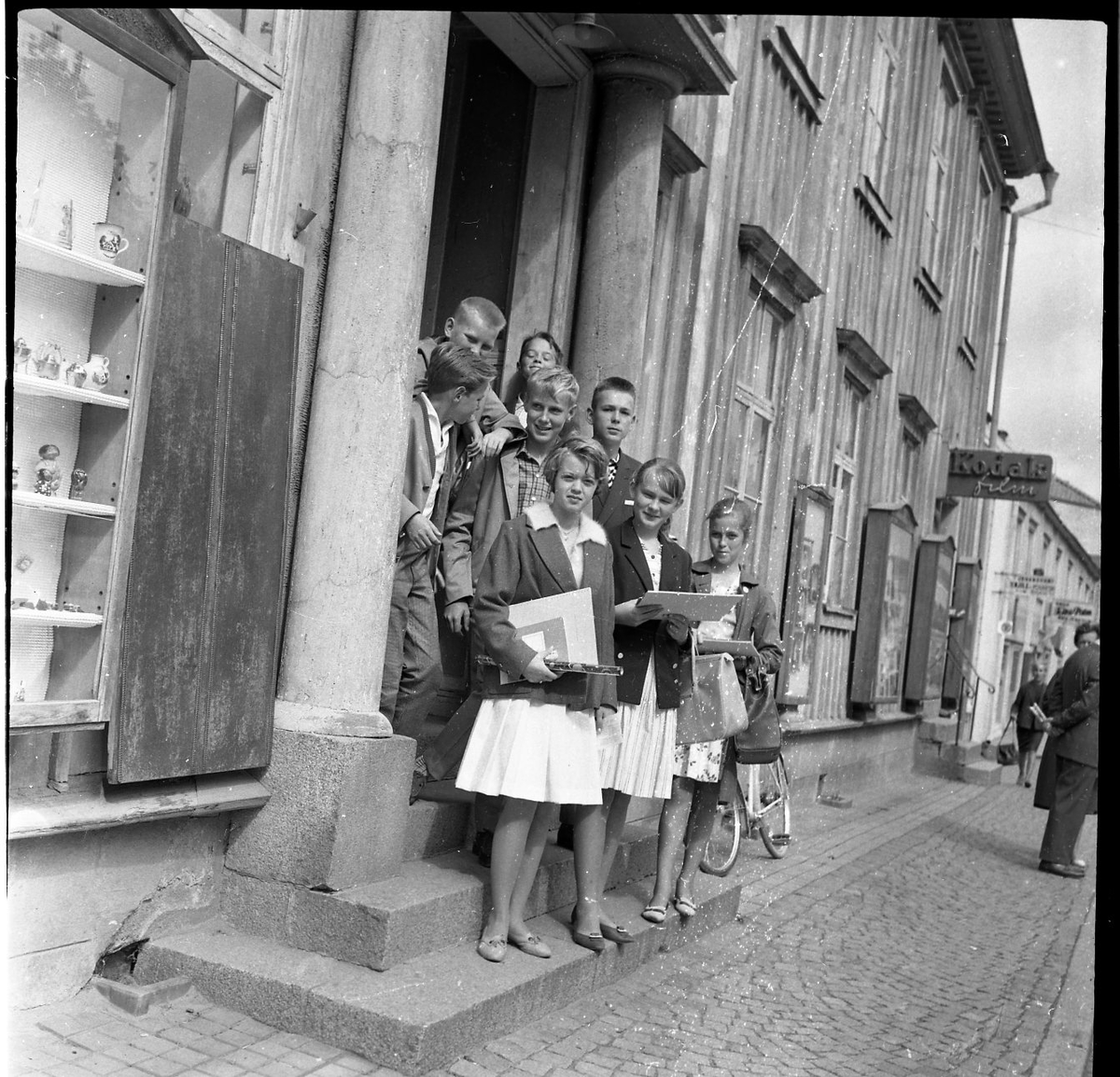 En grupp tonåringar, flickor och pojkar, står på trappan till Hallska gården, några har papper i händerna. Till om trappan står en cykel. På husfasaden längre bort sitter en neonskylt "Kodak film".