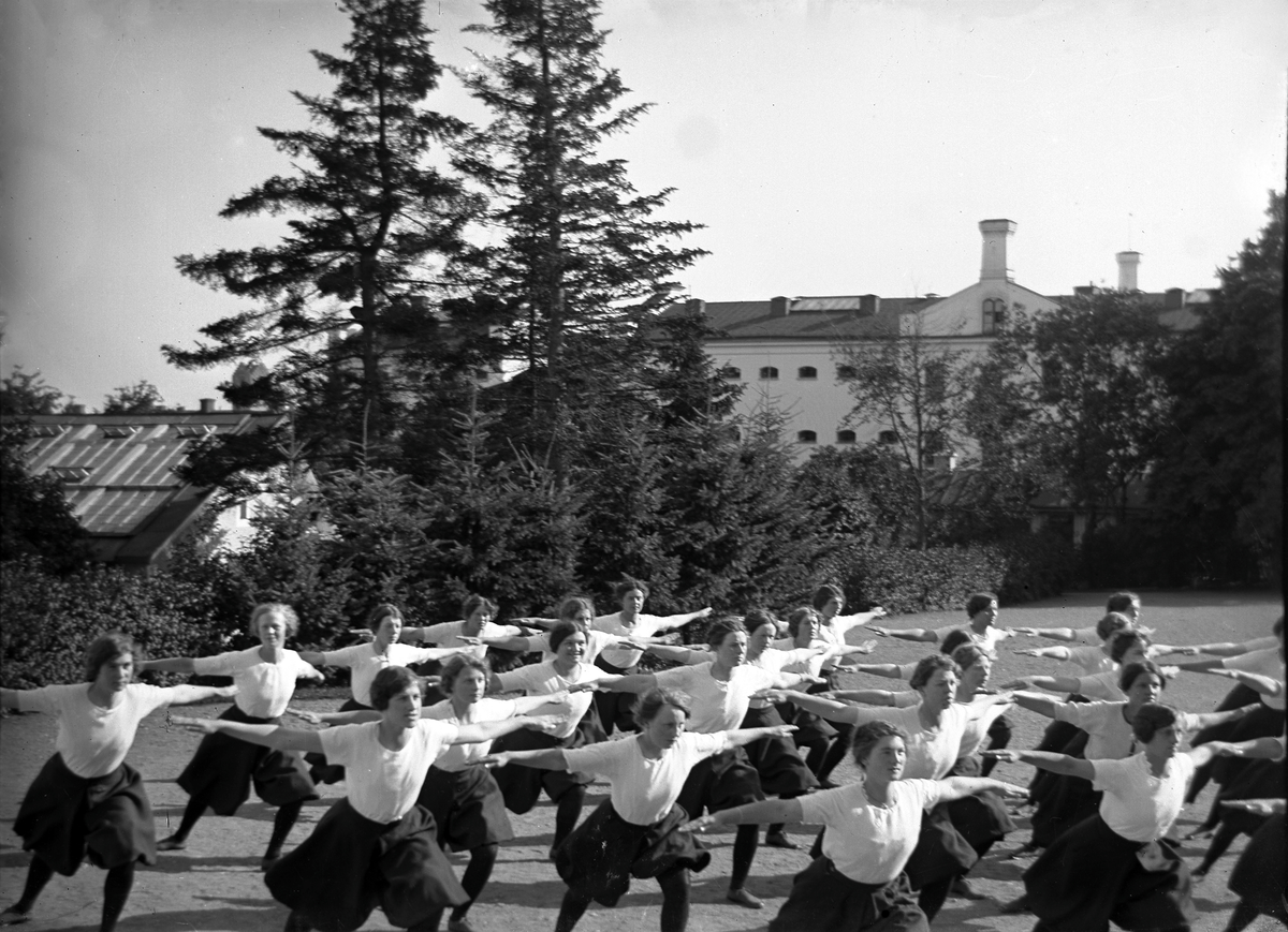 En trupp kvinnliga gymnaster övar i det fria utanför dåv. seminariet, dvs numera Ringsbergsskolan i Växjö. I bakgrunden syns skolans växthus och dåv. cellfängelset.