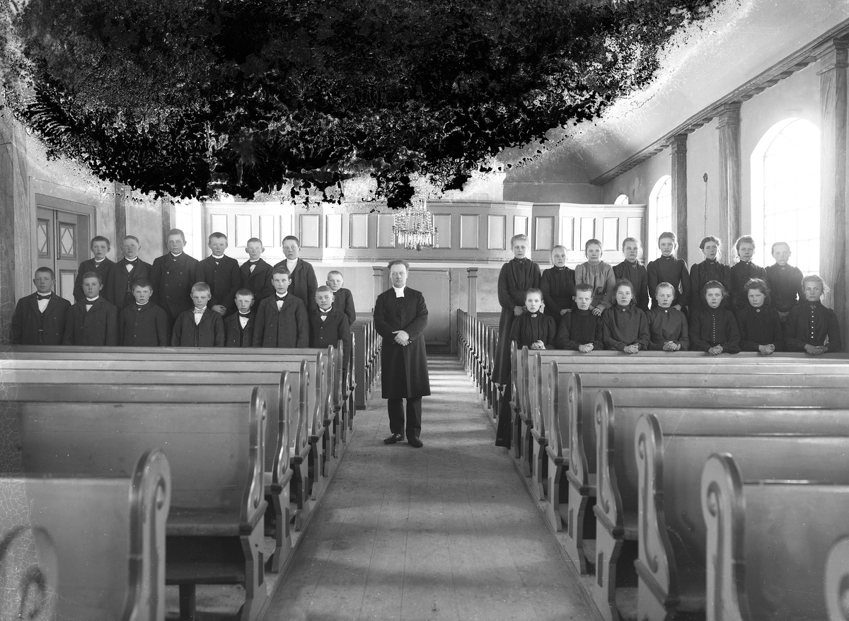 Konfirmander och präst avfotograferade i en kyrka, någonstans i Kronobergs län, ca 1908.