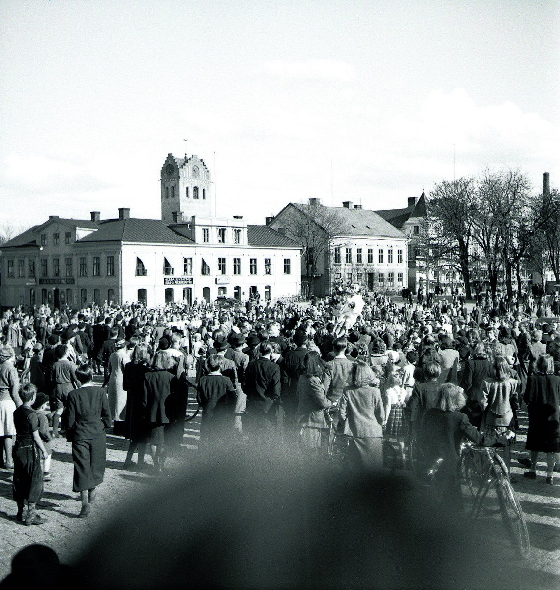 Några studenter hissas av anhöriga m.fl. på Stortorget. I bakgrunden
