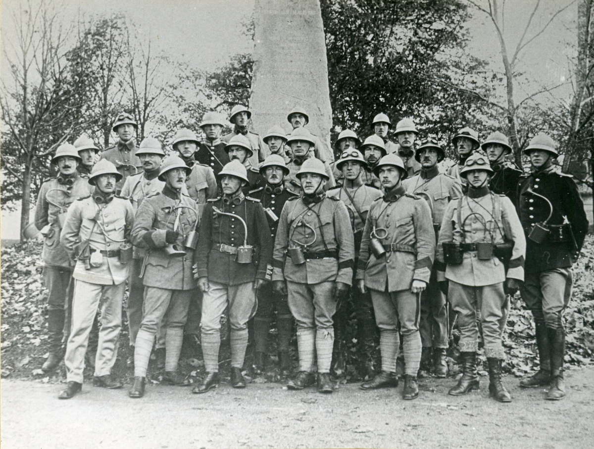 Svea ingenjörkår, Ing 1. Kurs för stormpatruller vid I 1 1917. Sergeant Liedbeck syns mitt för minnesstenen OBS särskilt prototyphjälmarna).