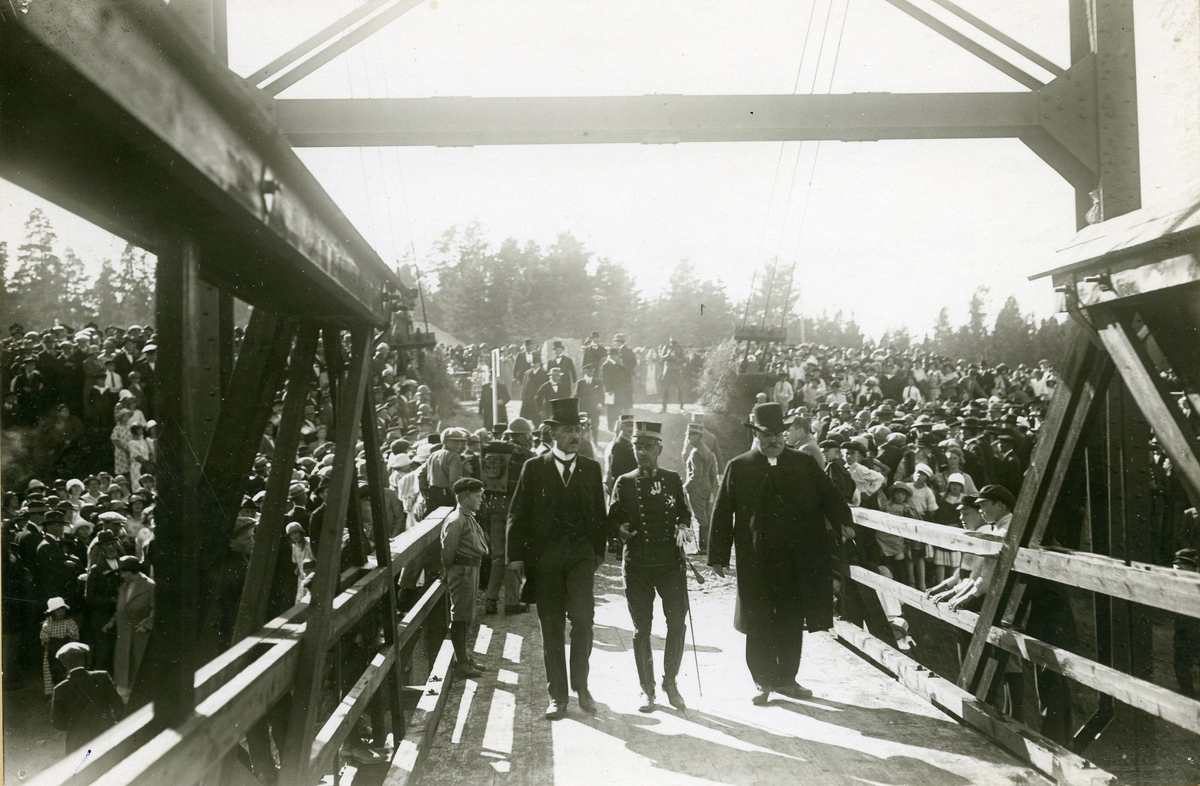 Svea ingenjörkår, Ing 1. Byggandet av hängbron över Dalälven vid Överboda 6 september 1924. På bron syns fr v landssekreterare Bring, generalmajor de Champs och kyrkoherde Tivell.