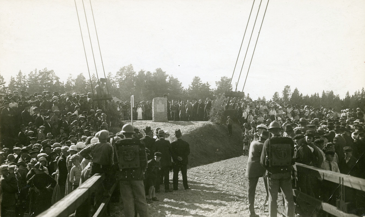 Svea ingenjörkår, Ing 1. Byggandet av hängbron över Dalälven vid Överboda 6 september 1924. Vid minnesstenen syns kyrkoherde Tivell, generalmajor de Champs, överstelöjtnant Bergenstråhle, överstelöjtnant Amundson och landssekreterare Bring.