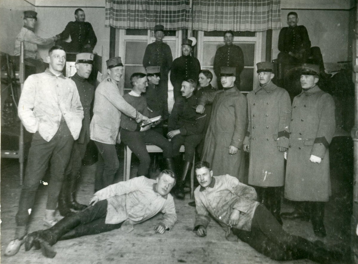 Svea ingenjörkår, Ing 1. Inom kasernetablissemanget på Kungsholmen vid Hovjaktvarvet. Ett logement på 3.kompaniet år 1910. Vid bordet fr v: korpralerna Magnusson och Thor, distinktionskorpral Liedbeck, korpralerna Hagberg och Johnsson-Ulfgrim.