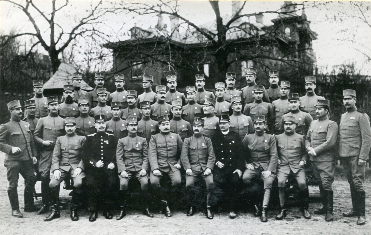 Förläggningen på Kungsholmen vid Hovjaktvarvet för Svea ingenjörkår, Ing 1. Underofficerskåren år 1908. Bakre raden fr v: Blomgren, Gripensköld, Holmer, Ohlsson, Borgström, Björnström, Sandh, Englund, Widqvist. Andra raden bakifrån fr v: Grudd, Trouin, Widén, Ribe, A Kilander, J Buddgård, Carlsson, Karlsson, Gudmundsson, Ljungqvist. Tredje raden bakifrån fr v: A Nilsson, Nordström, Franzén, Thor, Ternbom, C Johansson, Ernelius, J Pettersson, Ståhl, Björkman, Ivarsson, Westerling. Främre raden fr v: C Kilander, H Sandgren, Roos, Dahlberg, Cassel, Grönberg, Selmander, Söderberg. I bakgrunden Stabsbyggnaden.
