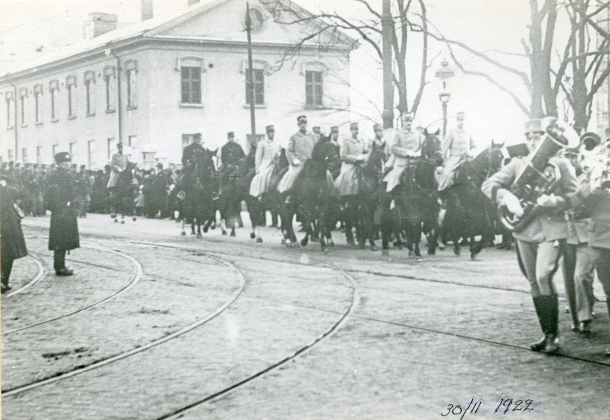 Svea ingenjörkår, Ing 1. 30 november 1922. Kåren på marsch genom Stockholm mot Frösundavik. Musikkåren leder marschen.